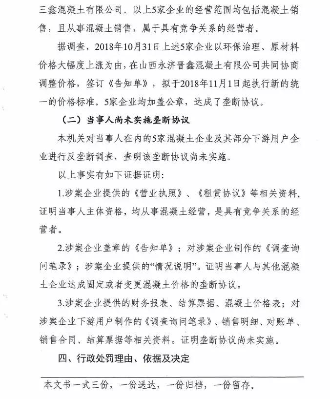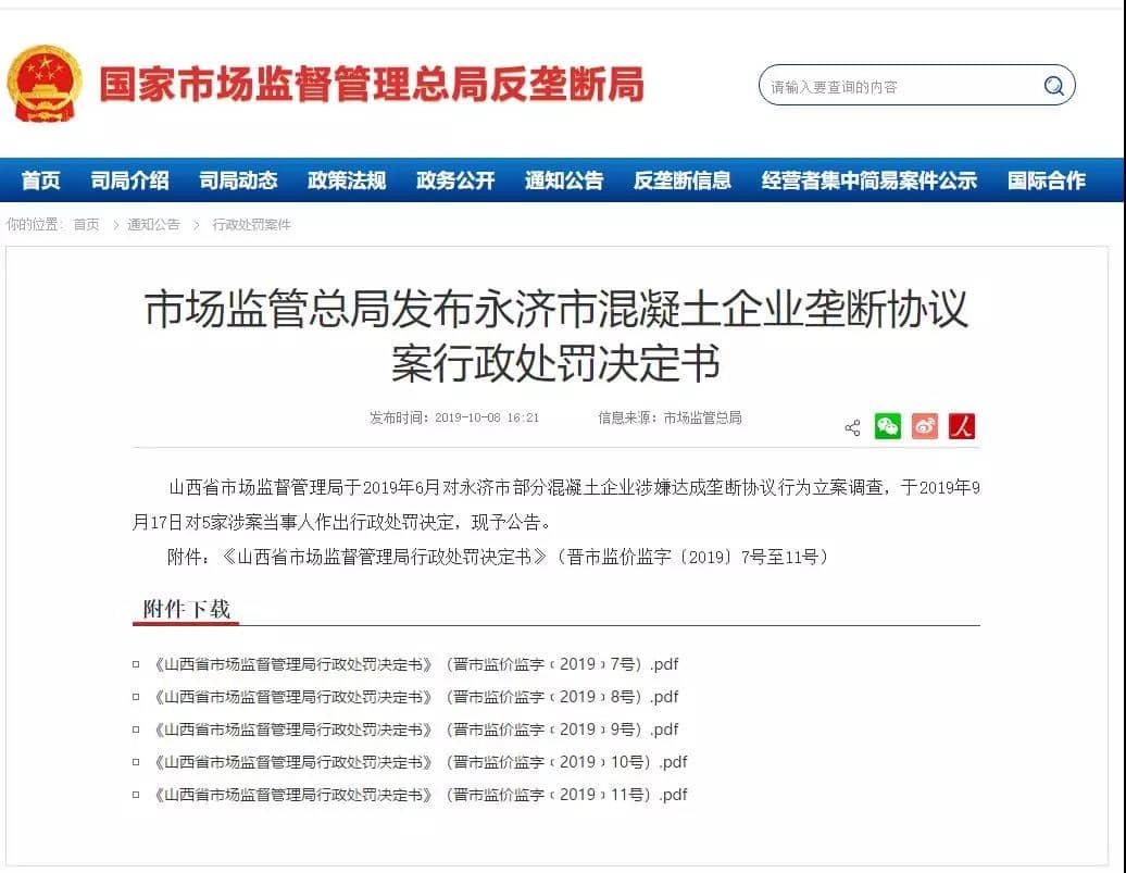 第7號處罰決定書提到根據群眾舉報,永濟市鑫力混凝土有限公司、永濟市寶寶混凝土有限公司、永濟市毅達混凝土有限公司、永濟市晉鑫混凝土有限、永濟市三鑫混凝土有限公司等五家企業于上年10月31日共同簽訂《商品混凝土調價告知單》約定于當年11月1日起執行統一約定的價格,涉嫌壟斷。