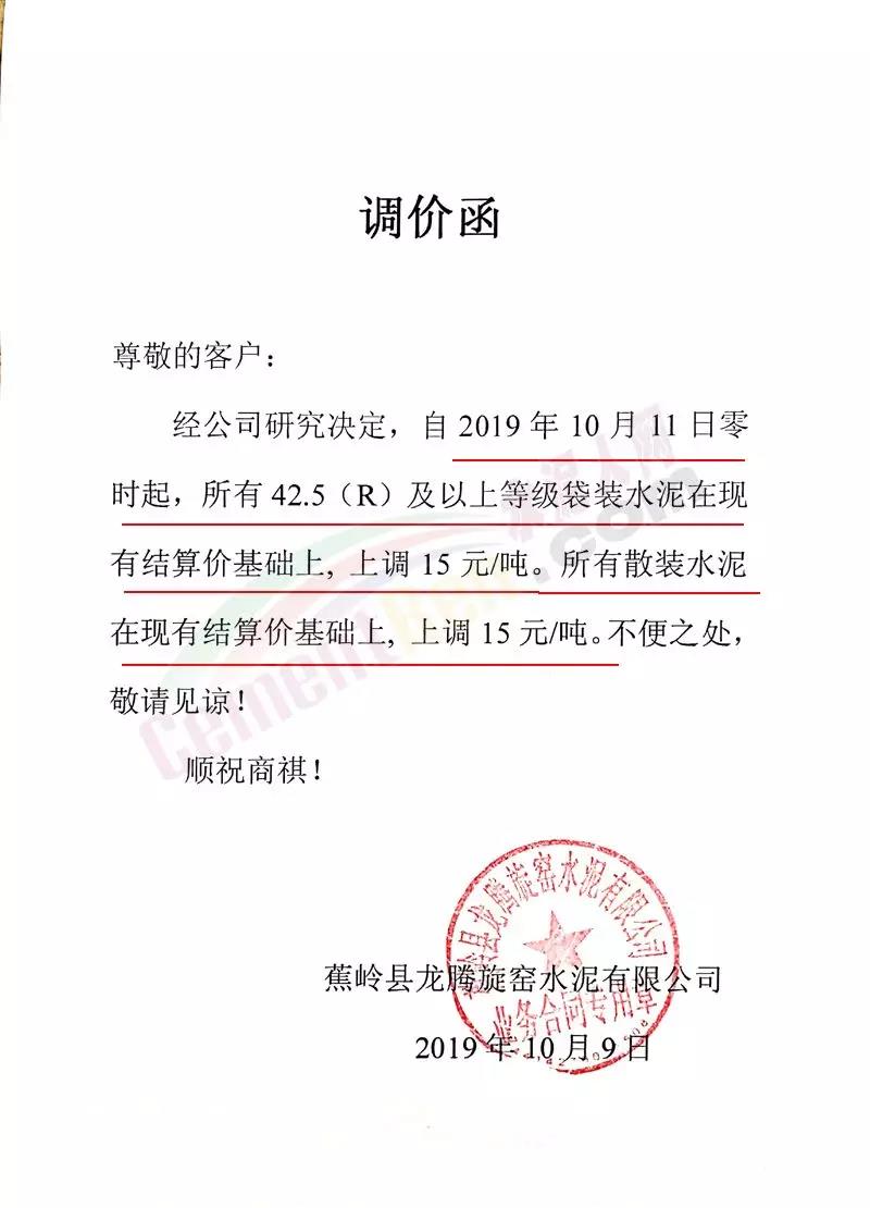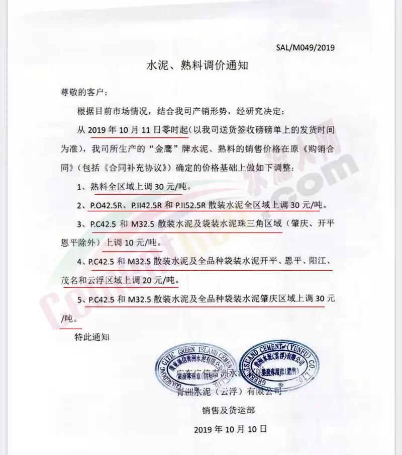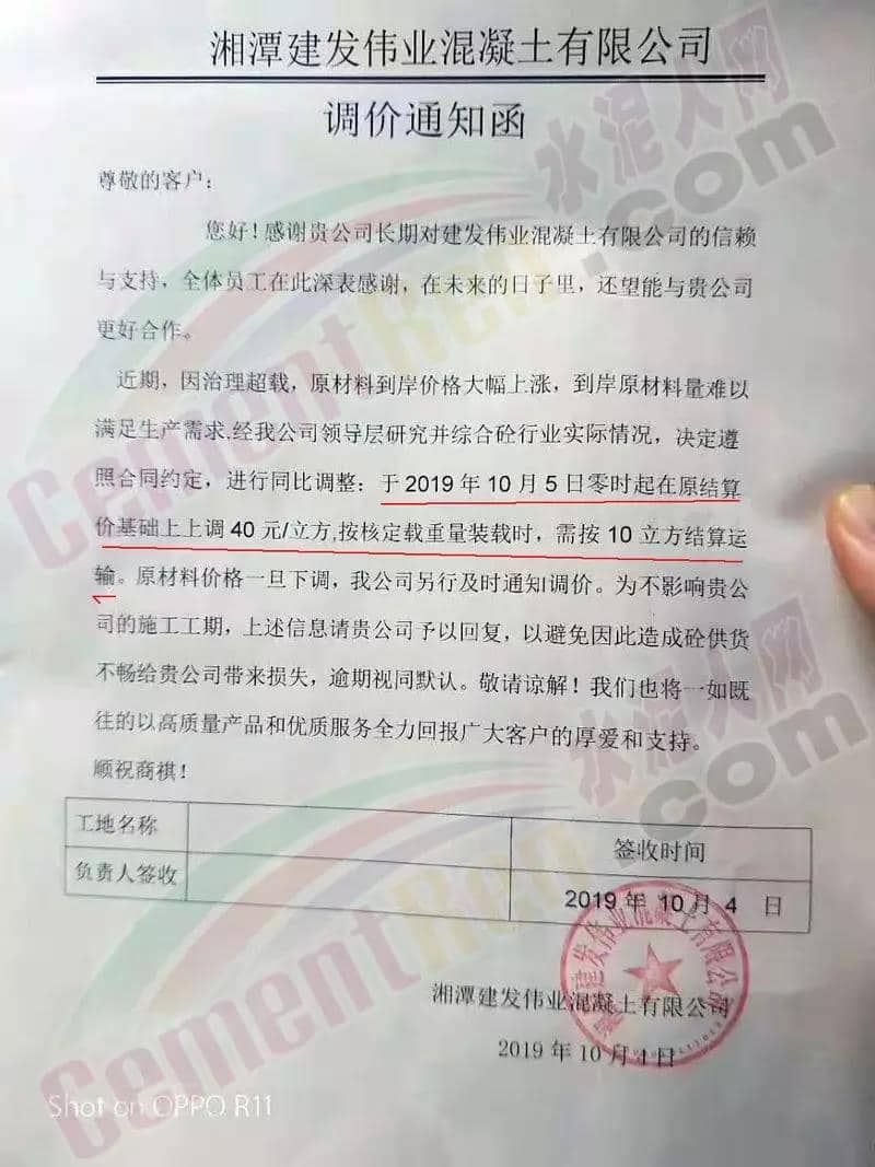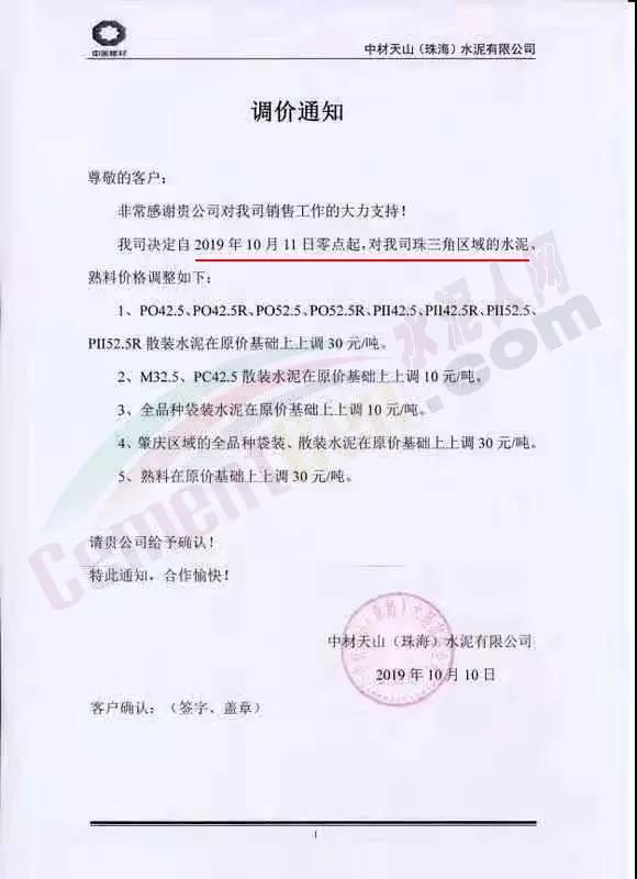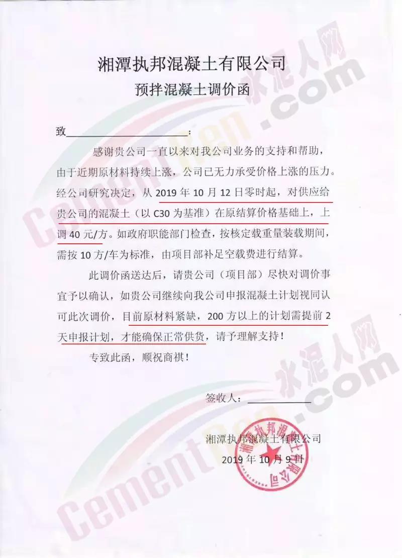 近來華中南區域,廣東,廣西、湖南、湖北以及華東江浙滬、福建、江西等區域眾多企業通知上調水泥價格,調價幅在40-10元/噸不等。同時因近期發生多起貨運車輛交通事故。多區域整治運輸車輛的超限力度加大。 或受上述因素影響,湖南部分區域混凝土企業通知上調砼產品價格。其中湘潭執邦混凝土有限公司預拌混凝土調價函稱,自10月12日零時起,C30上調40元/方,且200方以上的計劃需提前兩天申請。 水泥企業主方面,華南珠三角珠海海中貿易公司通知稱,根據當前行情公司的產銷形勢,于10月起上調出廠價格30元/噸。 區域內華潤、、中材、塔牌等水泥企業亦同時上調了水泥價格,漲價通知如下: