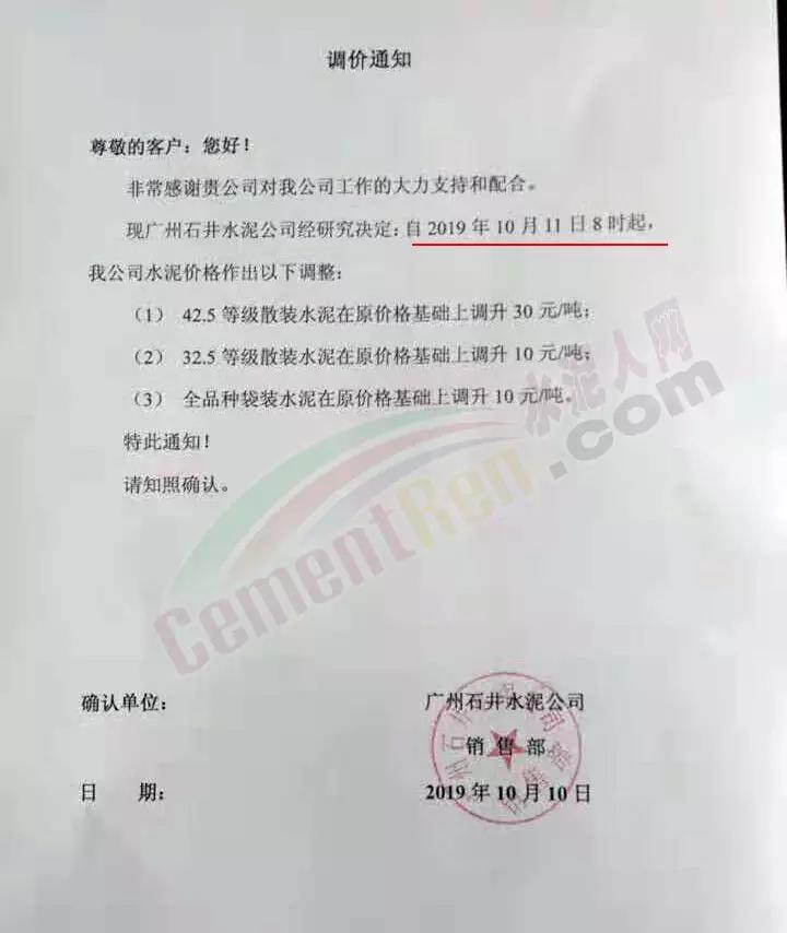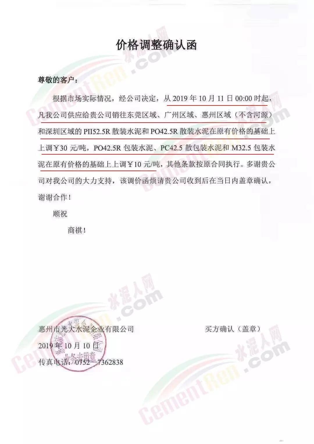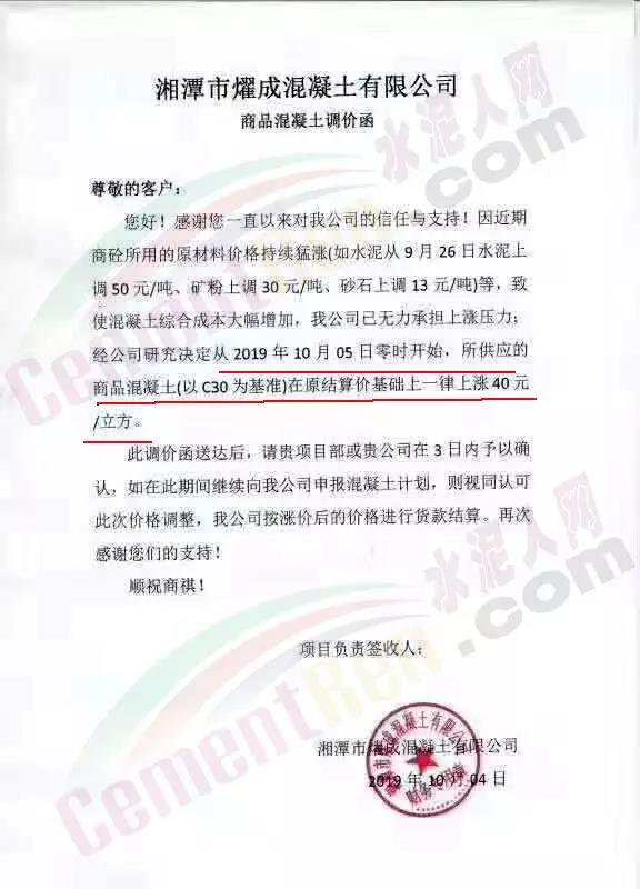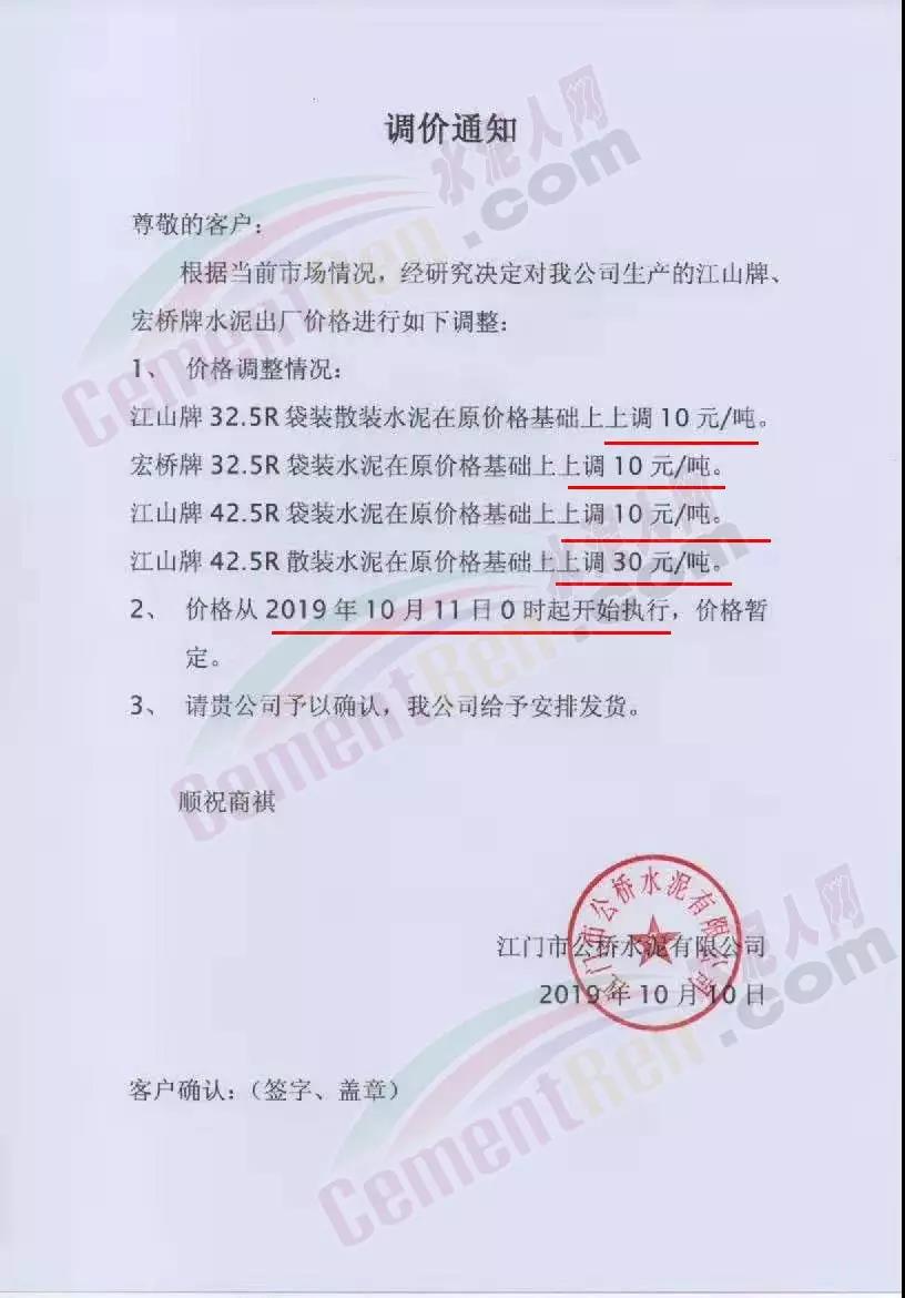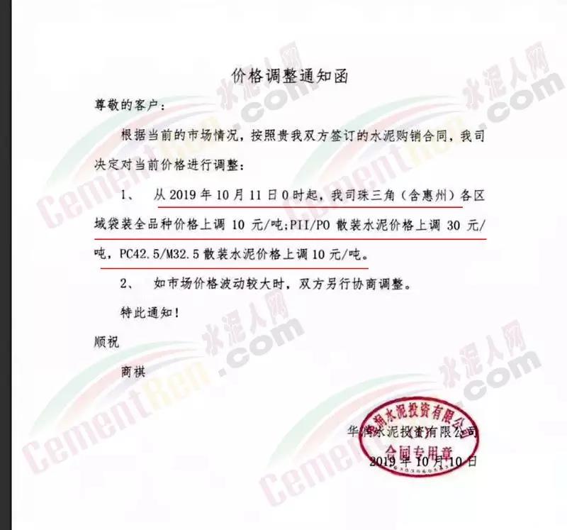 近來華中南區域,廣東,廣西、湖南、湖北以及華東江浙滬、福建、江西等區域眾多企業通知上調水泥價格,調價幅在40-10元/噸不等。同時因近期發生多起貨運車輛交通事故。多區域整治運輸車輛的超限力度加大。 或受上述因素影響,湖南部分區域混凝土企業通知上調砼產品價格。其中湘潭執邦混凝土有限公司預拌混凝土調價函稱,自10月12日零時起,C30上調40元/方,且200方以上的計劃需提前兩天申請。 水泥企業主方面,華南珠三角珠海海中貿易公司通知稱,根據當前行情公司的產銷形勢,于10月起上調出廠價格30元/噸。 區域內華潤、、中材、塔牌等水泥企業亦同時上調了水泥價格,漲價通知如下: