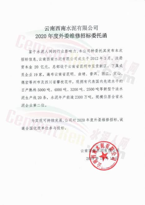 1、在中華人民共和國境內合法注冊的,具有獨立法人資格的有效經營資質;六、報名單位資格要求2、具備在2500t/d及以上新型干法熟料水泥生產線維修施工業績。七、其他為確保本次資質審查和招標的公平、公正、公開,特設舉報監督電話,歡迎各投標單位進行投訴舉報。八、監督投訴舉報電話:0871-63927381舉報郵箱:ynxnjw@163.com特此公告。 云南西南水泥有限公司2019年10月10日