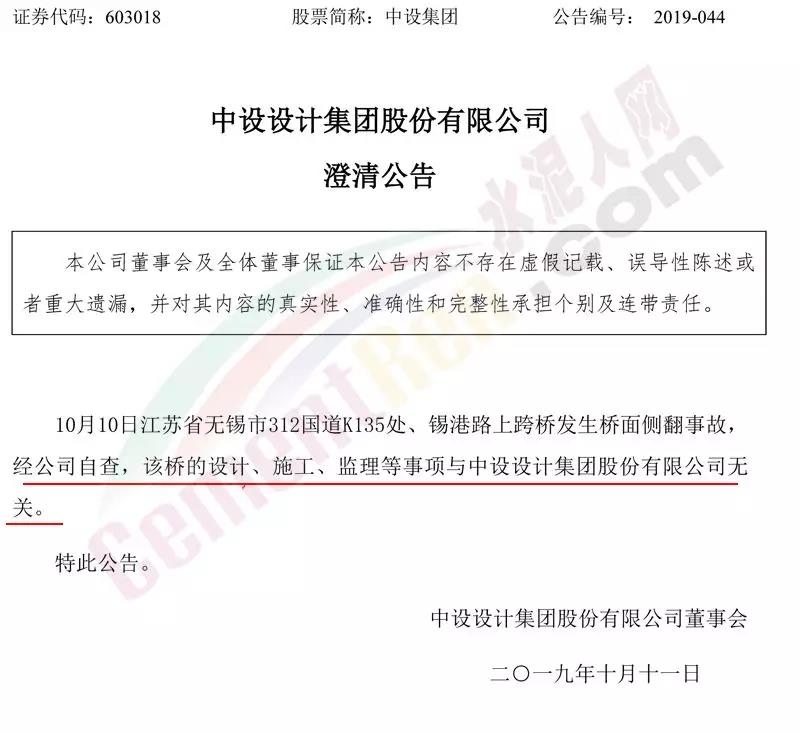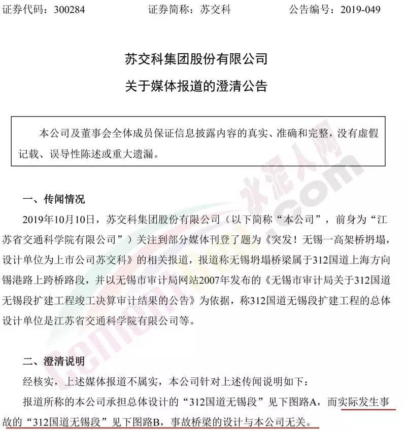 10月11日早間,該公司發公告稱,報道不屬實,公司承擔總體設計的“312國道無錫段”并非事故路段,事故橋梁的設計與公司無關。