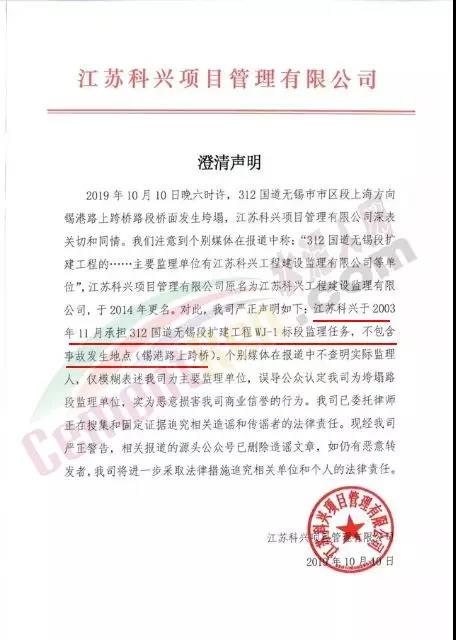 另一家名為江蘇科興項目管理有限公司的項目監理公司也發布了類似的澄清公告。稱其承擔的312國道無錫段擴建工程監理任務中,不包括事故發生地 點(錫港路上跨橋)。