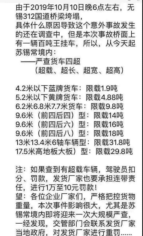 截至發稿時,已有常州、蘇州等多地下發通知,嚴查各類超載超限違法行為等,明確要求各治超站點開展24小時值守查處工作,進一步加強“百噸王”車輛查處力度,加大對普通公路收費站超限車輛查處工作,進一步加強貨運企業源頭管控工作。