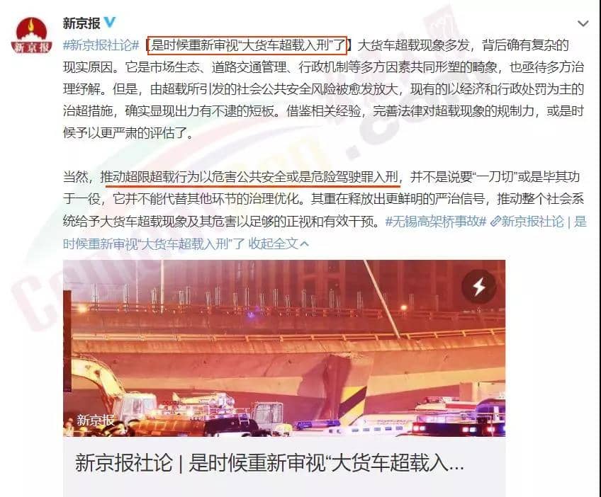 事故發生后,許多網友也紛紛表態支持對“超載”入刑,進一步加大對超載在法律層面的懲治力度。