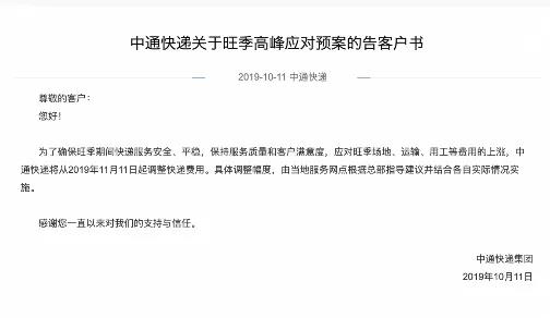 日前,中通快遞發布關于旺季高峰應對預案的告客戶書稱為了確保旺季期間快遞服務安全、平穩,保持服務質量和客戶滿意度,應對旺季場地、運輸 、用工等費用的上漲,中通快遞將從11月11日起調整費用。