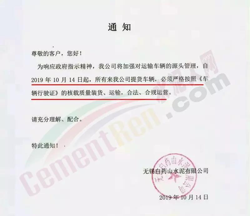 水泥人網消息:近日,多區域啟動了針對物流超限的重點整治。日前, 無錫白藥山水泥有限公司發布通知稱:江蘇省治超辦相關負責人表示,治超站將實行24小時值班值守制度,值班人員全程在崗在位,對超限超載行為發現一起,查處一起,決不姑息。嚴格落實“一超四罰”制度,盯住“人、車、企、源”,在執法中發現超限超載車輛,除依法責令卸載并處罰處,還要按照相關規定,對貨運車輛、駕駛人、運輸企業、貨運場所經營者實施相應處罰。鑒于上述情況,為了節實維護公路設施的完好和保障人民群眾生命財產安全,配合好治超工作。公司規定自10月14日起,水泥運輸車必須按照車輛行駛證核定的載質量運輸。并請各合作單位 宣貫落實到貨運車輛 。