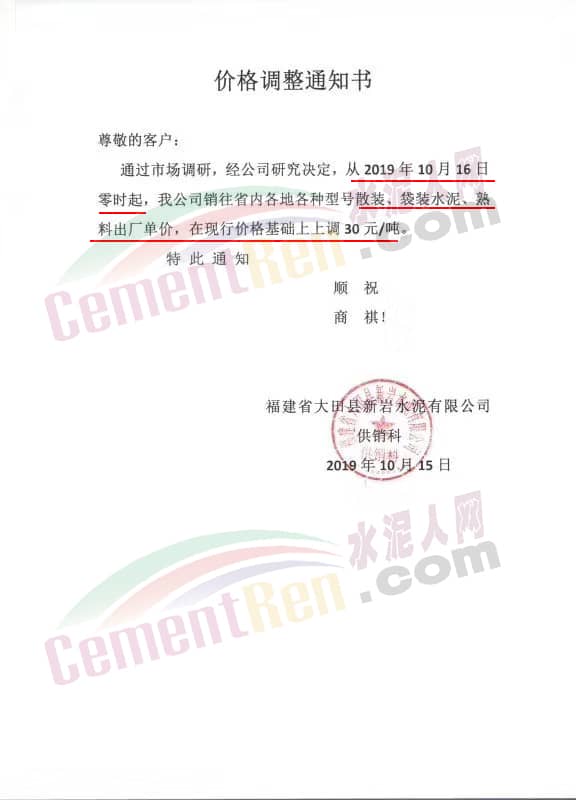 福建省大田縣新巖水泥有限公司供銷科價格調整通知書稱,從今日(16日)零時起,銷往省內各地各種型號散裝、袋裝水泥、熟料出廠單價在現行基礎上上調30元/噸。