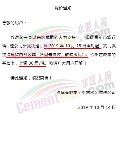 福建春馳集團新豐水泥有限公司通知自15日零時起上調福建省內各區域 ,各型號袋、散裝水泥出廠價格,上調