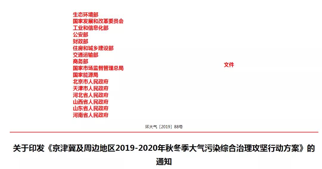 京津冀及周邊地區2019-2020年秋冬季大氣污染綜合治理攻堅行動方案