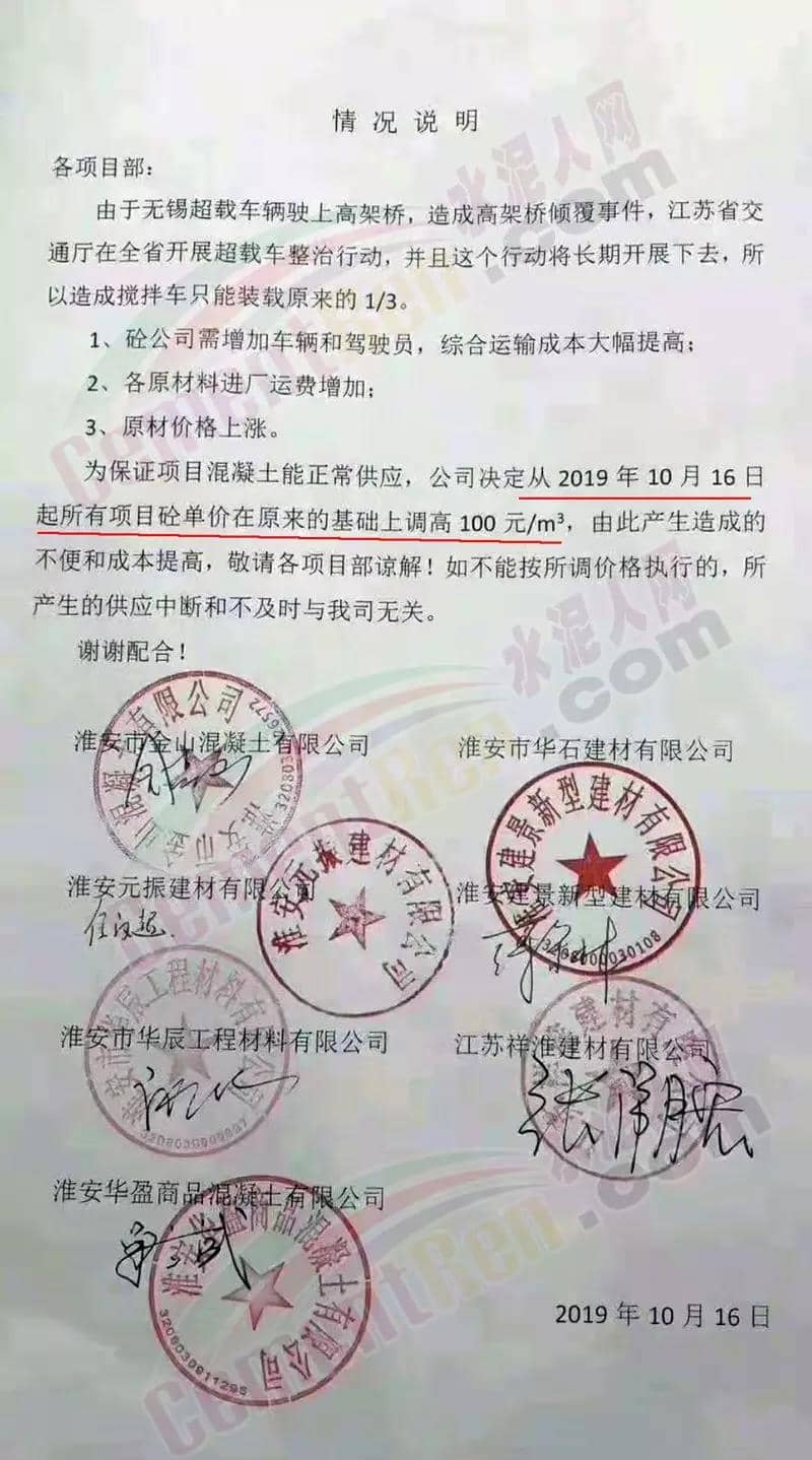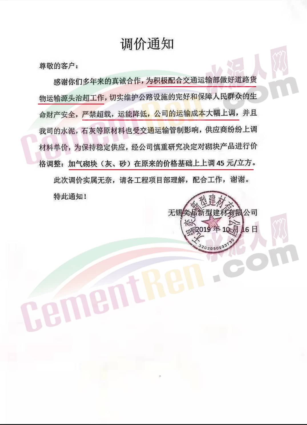 同期,江蘇無錫、江陰、常州等市水泥制品企業(yè)集體發(fā)布調價通知。多企業(yè)通知稱:由于超載事故頻發(fā),交通運輸部狠抓貨物運輸源頭治超工作影響,導致快遞、物流運輸、水泥、石灰等原材料漲價,水泥制品也隨之漲價。因原材料運輸成本大幅攀升,加氣砌塊(灰、砂)價格在原基礎上上調10-45元/立方。宜興市邦迪建材有限公司調價通知稱,因公司采購水泥、石灰、煤灰、黃沙等原材料價格漲幅較大,同時公司砌塊產品出運嚴禁超載,導致公司運輸成本大幅攀升,公司慎重決定對加氣砌塊(灰、砂)價格在原有基礎上上調45元/立方。