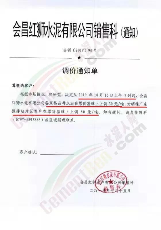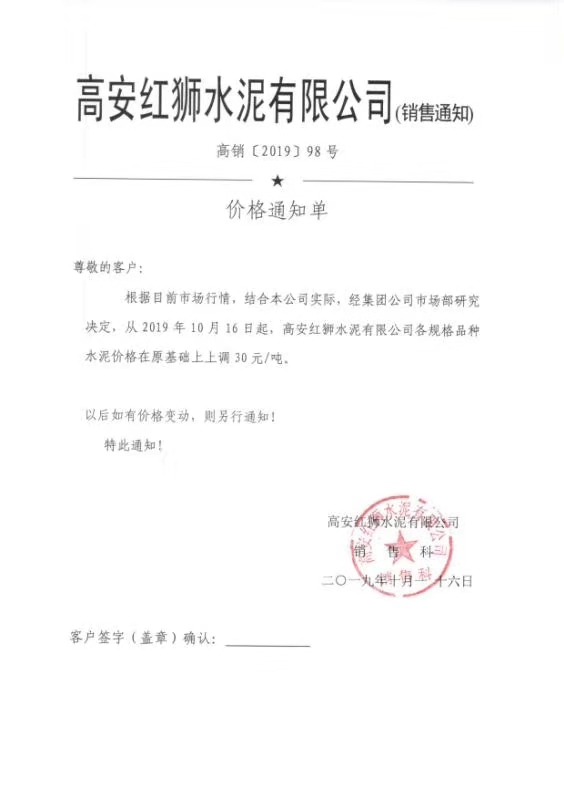 感謝您一直以來對南方水泥的信任和支持,根據市場行情變化,我公司經研究決定:自2019年10月15日上午8點開始,所有品種水泥價格在原有基礎上上調30元/噸。感謝您一如既往的支持。----溫馨提示:價格調整后,如您繼續(xù)安排:到我公司提貨,則視為確認本次研究調整,感謝您的支持,特此通知!