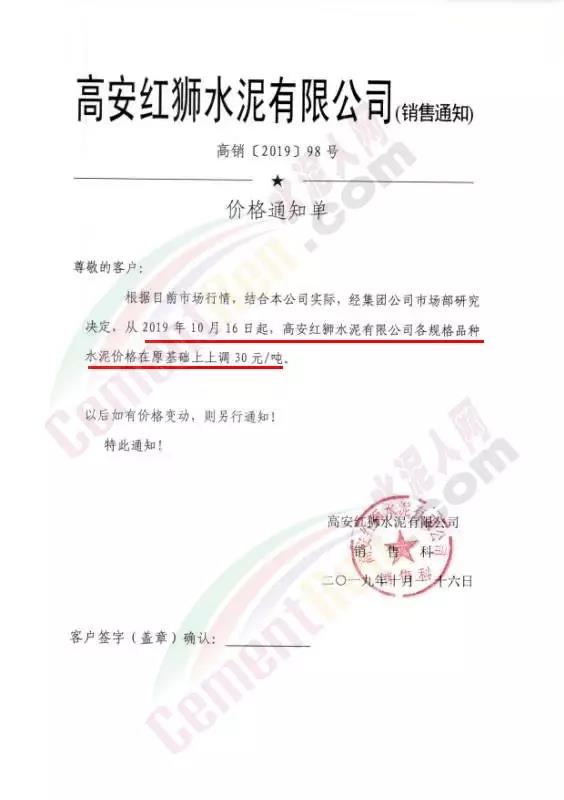 同期,江西區(qū)域主導企業(yè)紅獅水泥、南方水泥等也上調了水泥價格,調價通知如下: