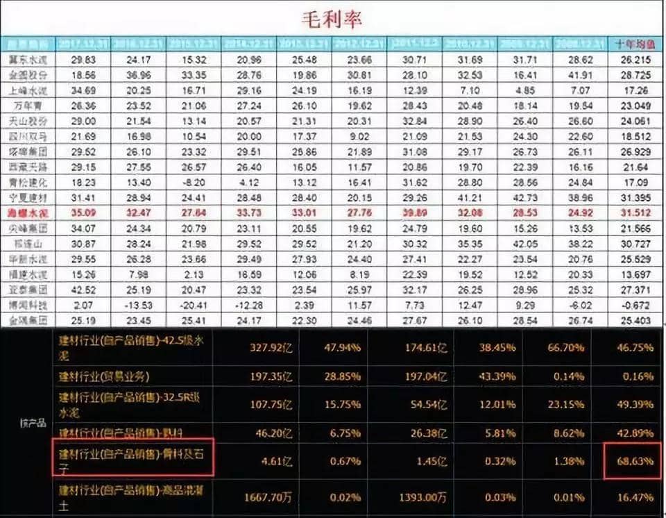 這里匯總了18家上市公司近十年的毛利率情況。毫無懸念,海螺水泥毛利率十年均值是同行業最高的。從產品的角度來看,我們很難看出到底是哪一類產品決定著毛利率,因為海螺水泥的產品中前三種幾乎差不了多少。