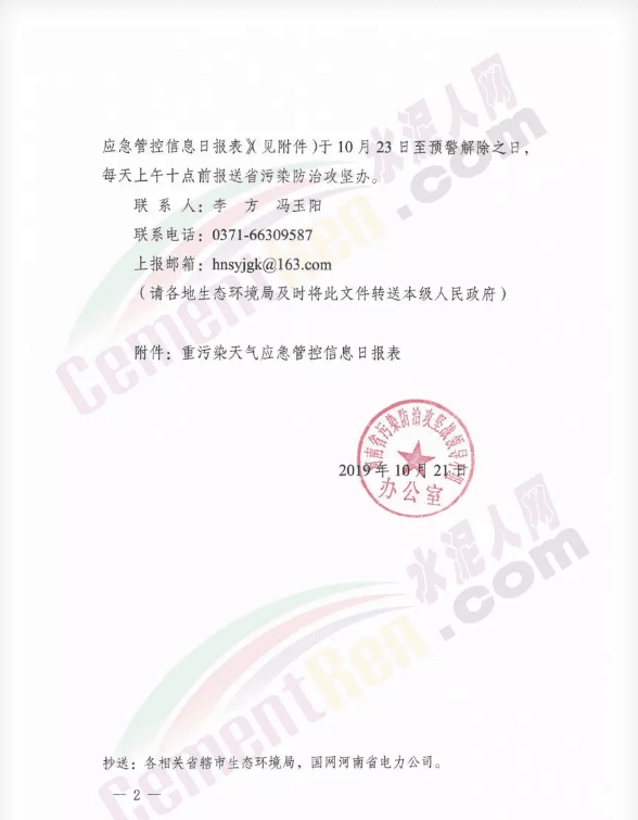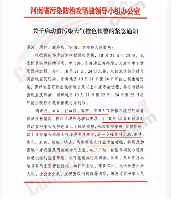 水泥人網消息,日前河南省污染防治攻堅戰領導小組辦公室發布的《關于啟動重污染天氣橙色預警的緊急通知》要求漯河、周口、駐馬店、南陽,信陽5個地區根據環境空氣質量預測預報情況,按照區域應急聯動要求,于10月22日0時及時啟動重污染天氣橙色及以上級別預警,采取管控措施。