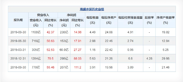 水泥人網(wǎng)消息:海螺水泥10月23日最新公布的2019年三季報(bào)顯示,前三季度營業(yè)收入1108億元,同比增長42.37%;歸屬于上市公司股東的凈利潤238億元,同比增長14.96%。基本每股收益4.49元。