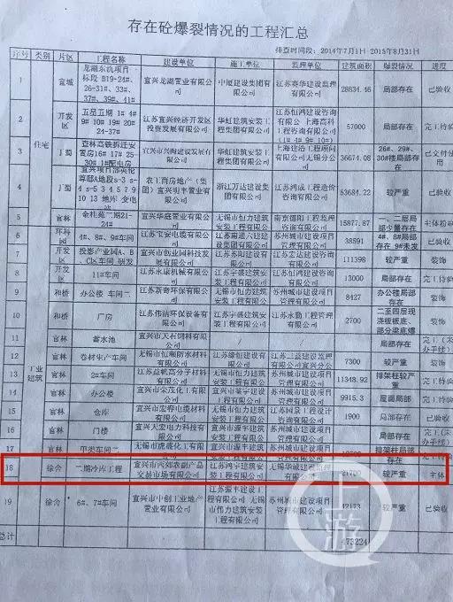 記者獲取的一份由當地施工主管部門出具的《存在砼爆裂情況的工程匯總》表顯示,同期使用宜興市三木建材有限公司混凝土導致項目出現質量問題的工程共有19處,建筑面積達473224平方米。其中爆裂情況較嚴重的項目共有4個,西郊農副產品交易市場就是其中之一。
