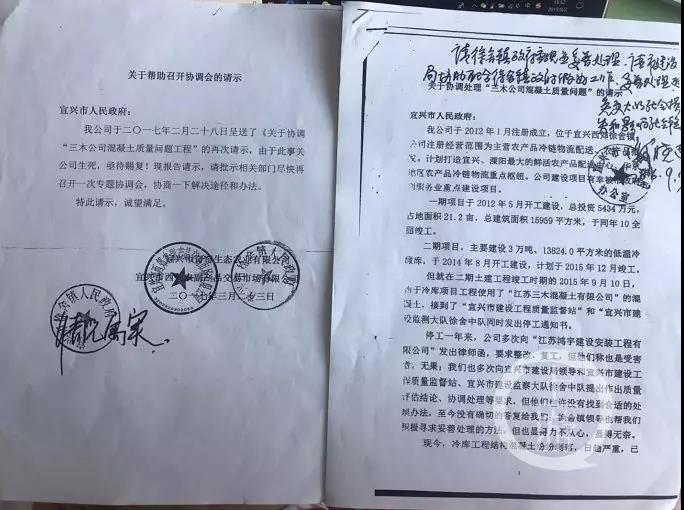 4年里,周順奇一次又一次向宜興市委市政府、宜興市住建局反映,尋找鑒定和處理結果,但收效甚微,期間隨著爆點的增多,原本的冷庫也已經成為危樓。 據周順奇提供的自2016年至2017年多份政府批文顯示,宜興市人民政府曾多次要求宜興市住建局配合徐舍鎮妥善處理好西郊農副產品交易市場因混凝土質量問題停工問題。但周順奇稱:“住建部門多次要求我們做鑒定,交了大筆的鑒定費后,只是說混凝土存在不穩定因素,但并沒有說明該建筑是否應當被拆除或可以改為他用,也沒有說明混凝土企業是否應承擔相應責任。”由江蘇省東南建設工程安全鑒定有限公司出具的兩份鑒定報告也證實了周順奇的說法。事故發生后,宜興市住建局始終未追究宜興市三木建材有限公司“生產銷售假冒偽劣產品”的責任。2017年8月,周順奇將宜興市人民政府、宜興市住建局告上法庭。請求無錫市中級人民法院依法認定宜興市人民政府、宜興市住建局對造成建設工程特大質量事故的處置嚴重失控,屬行政不作為;同時判令兩部門及時按照國務院關于《生產安全事故報告和調查處理條例》嚴格執行。“混凝土生產企業需要由經信委的立項,住建局的審批和環保局的環評報告,而且還要辦理銷售許可證,而我了解到宜興市三木建材有限公司的證件并不齊全。”周順奇說。據2018年1月16日無錫市中級人民法院庭審筆錄顯示,庭審中,對于周順奇的訴求請求,宜興市人民政府、宜興市住建局稱其均嚴格按照相關法律規章的規定,依法履行了各項職責,并不存在違法情形。同時,宜興市住建局表示,目前事故原因和事故經過已很清楚,但造成的損失無法確認。后經法院協調,2019年1月18日,宜興市人民政府向無錫市中級人民法院送達了協調函。關于周順奇一案,目前宜興市人民政府正在積極協調處理此事,要求暫停審限。