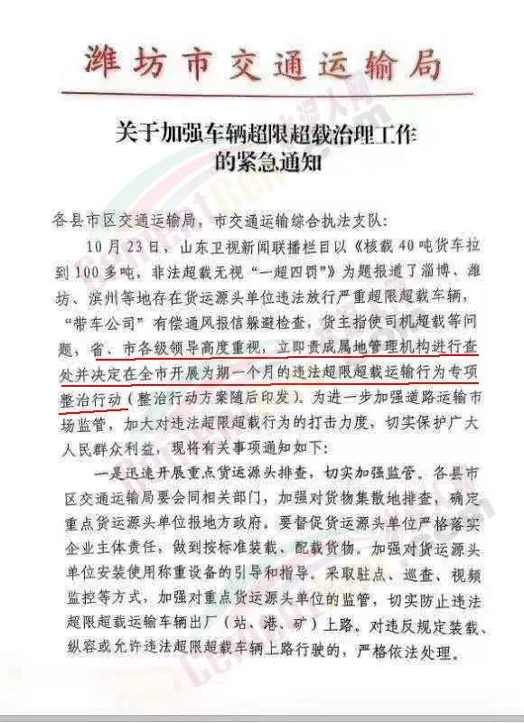 為進一步加強道路運輸市場監管,加大對違法超限超載行為的打擊力度,切實保護廣大人民群眾利益,并將相關事項通知如下:一、迅速開展重點貨運源頭排查,切實加強監管各縣市區交通運輸局要會同相關部門,加強對貨物集散地排查,確定重點貨運源頭單位報地方政府,要督促貨運源頭單位嚴格落實企業主體責任,做到按標準裝載、配載貨物。加強對貨運源頭單位安裝使用稱重設備和引導和指導。采取駐點、巡查、視頻、監控等方式,加強對重點貨運源頭單位的監管,切實防止違法超限超載運輸車輛出廠(站、港、礦)上路。對違反規定裝載、縱容或允許違法超限超載車輛上路行駛的,嚴格依法處理。二、認真開展治超聯合執法各縣市區交通運輸局要按照地方、部門多方聯動的原則,針對轄區內超限運輸車輛的流量,流向特別,對重點區域 、重點路段超限超載車輛,切實加大執法檢查力度。積極鞏固和深化同公安部門的聯合執法機制,按照《濰坊市治理車輛超限超載聯合執法常態化制度化工作實施方案的通知》(濰交【2018】117號)要求,集中監管執法力量,開展聯合執法,嚴格實施“一超四罰”,始終保持嚴管態勢。同時,對非法帶路,為違法運輸車輛提供保護以及強行闖關、故意堵塞交通、破壞治超檢測設施設備、聚眾門事、暴力抗法等嚴重違法行為,依法從嚴打擊。要建立健全“黑名單”制度,將車輛及企業違法信息按照國家和省有關規定納入信用信息系統,依法實施懲戒。三、切實提高政治站位各縣市區交通運輸部門要切實提高政治站位,充分認清車國內超限超載治理工作的重要性,牢固樹立安全發展理念,嚴格落實安全生產責任制,堅持嚴管與嚴打相結合 ,積極與當地公安交警部門開展聯合執法,切實維護好道路運輸秩序。通知原文如下: