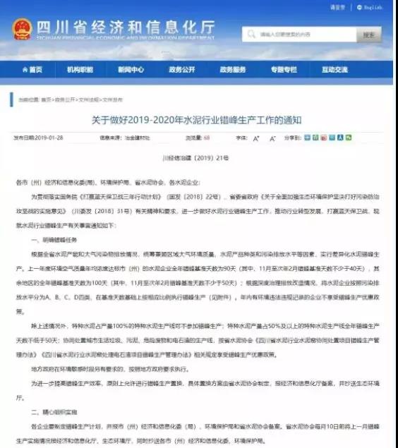 今年1月初,四川省四川省工業和信息化廳與四川省生態環境廳聯合發布《關于做好2019-2020年水泥行業錯峰生產的通知》要求上一年度環境空氣質量年均濃度達標市(州)的水泥企業全年錯峰基準天數為90天(其中,11月至次年2月錯峰基準天數不少于40天),其余地區的全年錯峰基準天數為100天(其中,11月至次年2月錯峰基準天數不少于50天);除上述情況外,特種水泥占產量100%的特種水泥生產線可不參加錯峰生產;特種水泥產量占50%及以上的特種水泥生產線全年錯峰生產天數不低于50天;協同處置城市生活垃圾、污泥、危險廢物和電石渣的生產線,按四川省水泥協會相關管理辦法規定享受錯峰生產優惠政策。