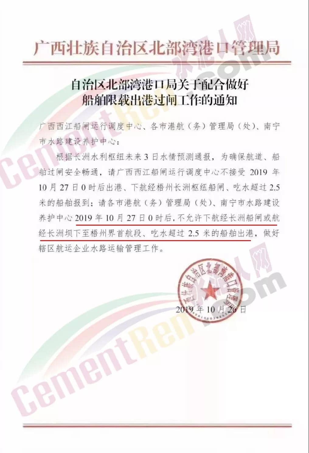 據水泥人網了解,26日廣西壯族自治區北部灣港口管理局發布《自治區北部灣港口局關于配合做好船舶限載出港過閘工作的通知》稱,根據長洲水利樞紐未來3日水情預測通報,為確保航道、船舶過閘安全暢通,請廣告西西江船閘運行調度中心不接受2019年10月27日0時后出港、下航經梧州長洲樞紐船閘、吃水超過2.5米的船舶報道。請各市港航(務)管理局(處)、南寧市水路建設養護中心2019年10月27日0時后,不允許下航經長洲船閘或航經長洲壩下至梧州界首航段,吃水超過2.5米的船舶出港,做好轄區航運企業水路運輸管理工作。