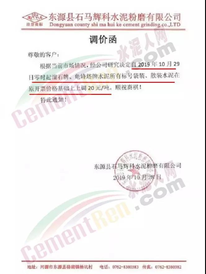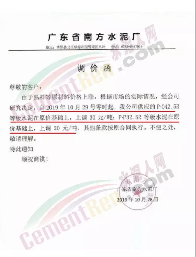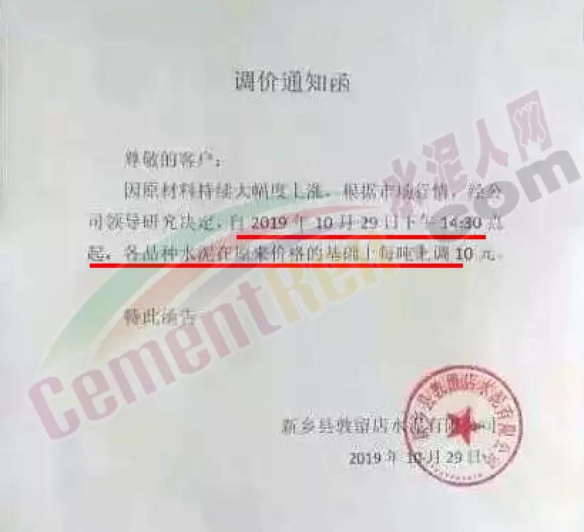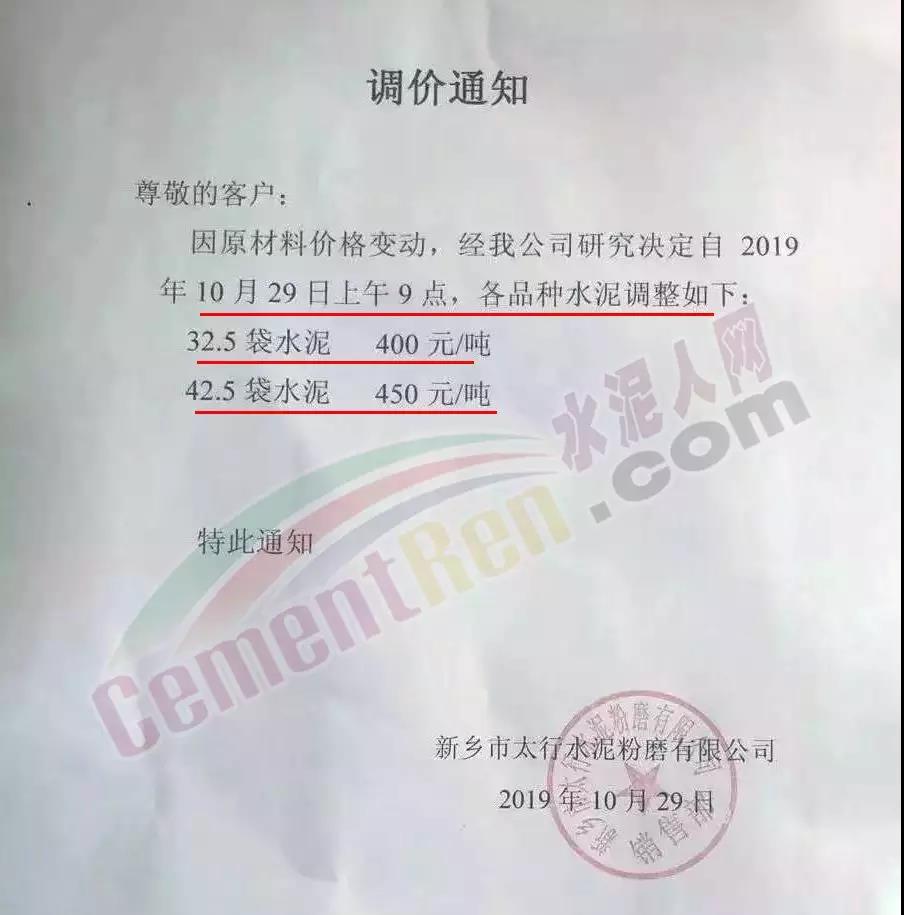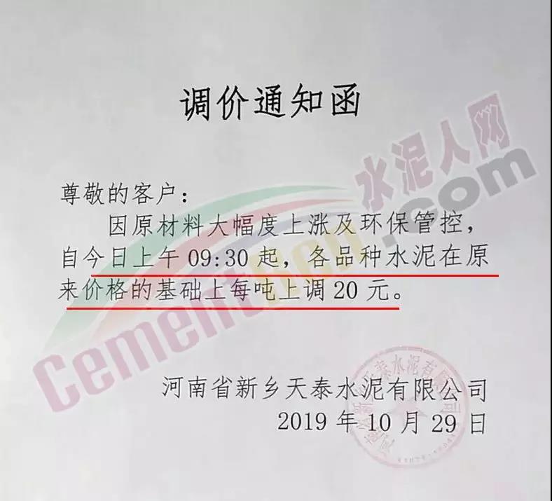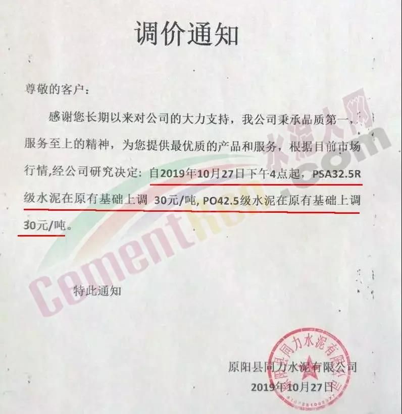 通知:今天(10月29日)中午12點起,春江水泥在原價基礎上每噸上調20元。