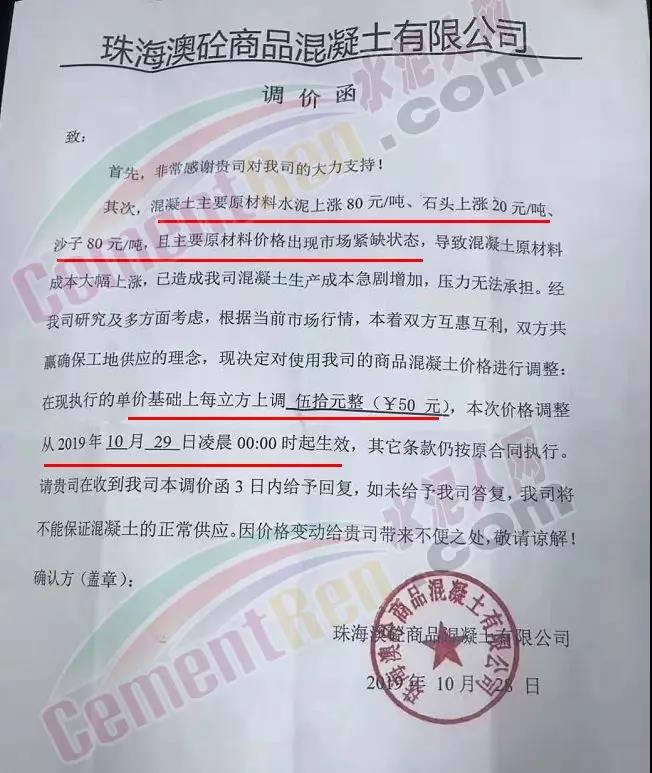 珠海澳砼商量混凝土有限公司調價函稱,混凝土主要原材料水泥上漲80元/噸、石頭上漲20元/噸、沙子80元/噸,且主要原材料價格出現市場緊缺狀態,導致混凝土原材料成本大幅上漲,已造成公司混凝土生產成本急劇增加,壓力無法承擔。公司決定對商品混凝土價格進行調整,在現執行單價基礎上上調50元/立方,本次價格調整從10月29日凌晨0時起生效。