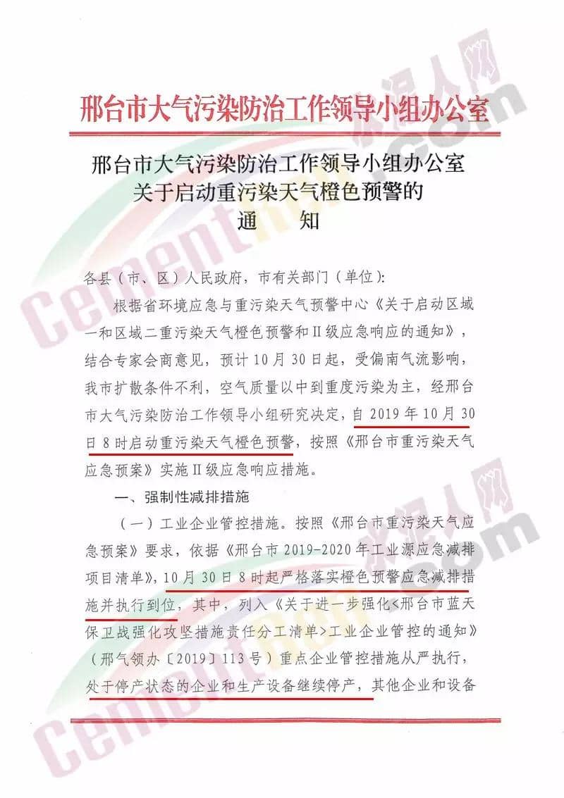 河北邢臺市大氣污染防治工作領導小組辦公室發布《關于啟動重污染天氣橙色預警的通知》要求,自10月30日8時起啟動重污染天氣橙色預警,按照《邢臺市重污染天氣應急預案》實施II級應急響應措施。并要求10月30日8時起嚴格落實橙色預警應急減排措施并執行到位,列入《關于進一步強化<邢臺市藍天保衛戰強化攻堅措施責任分工清單>工業企業管控的通知》文件的重點企業管理措施從嚴執行,處于停產狀態的企業和生產設備繼續停產。通知原文如下: