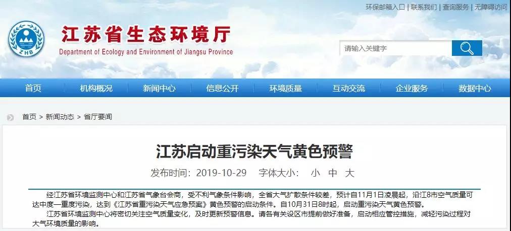 江蘇省生態環境廳消息:經會商,受不利氣象條件影響,江蘇全省大氣擴散條件較差,預計自11月1日凌晨起,沿江8市空氣質量可達中度—重度污染,達到《江蘇省重污染天氣應急預案》黃色預警的啟動條件。建議自10月31日8時起,啟動重污染天氣黃色預警。