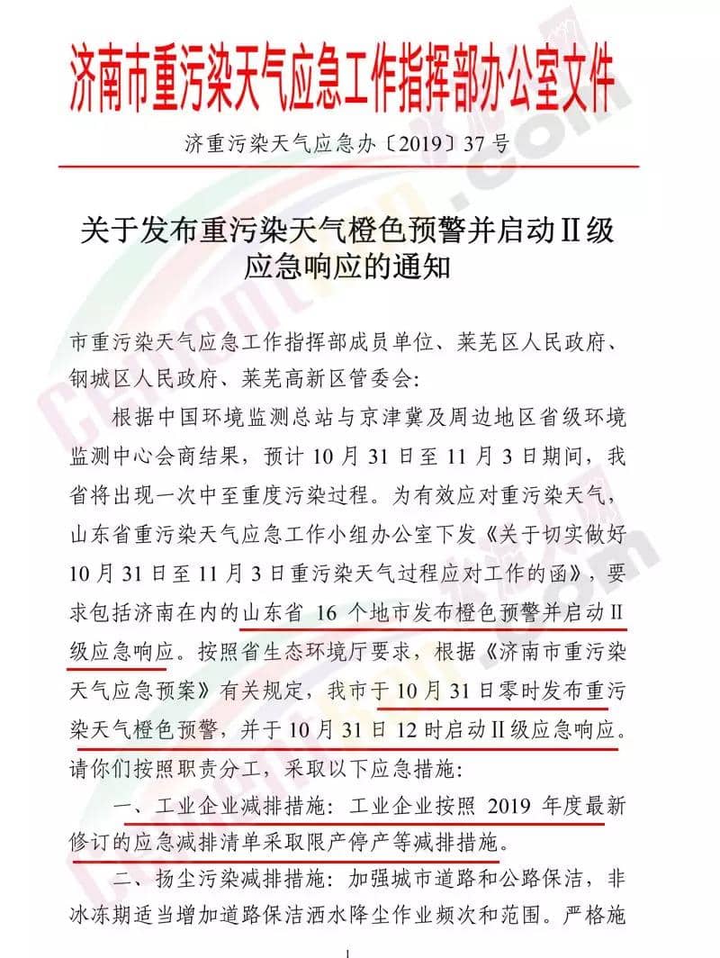 山東省16個地市發布橙色預警并啟動II級應急響應,其中濟南市于10月31日12時啟動II級應急響 應。工業企業按照2019年度最新修訂的應急減排 清單采取限產停產等減排措施。