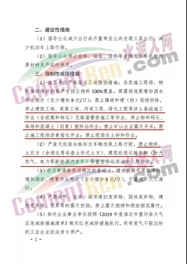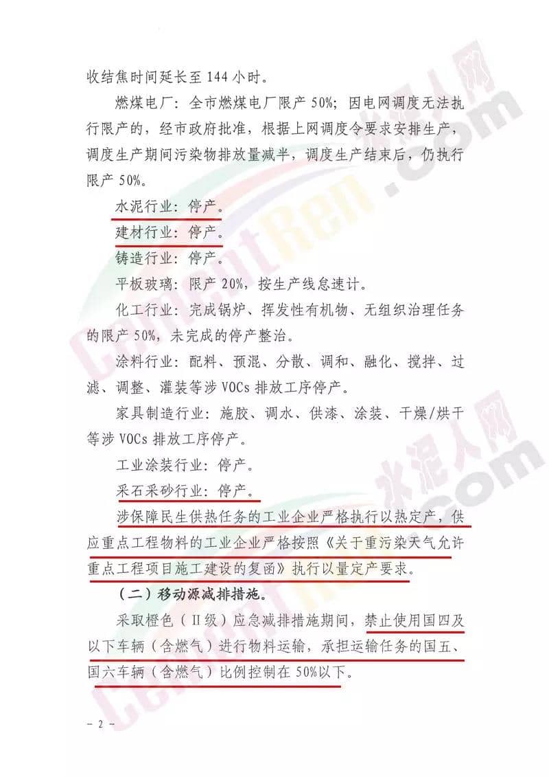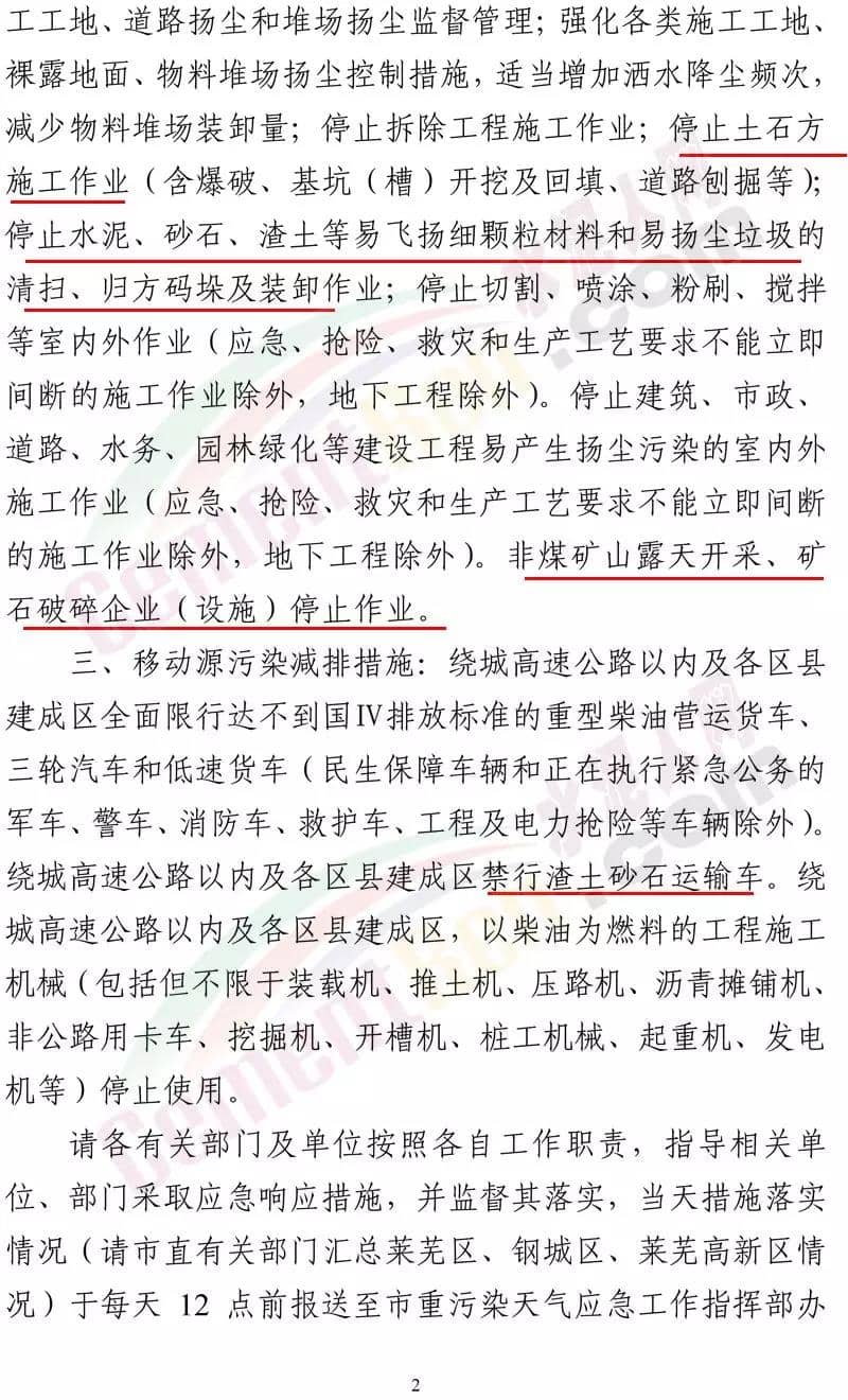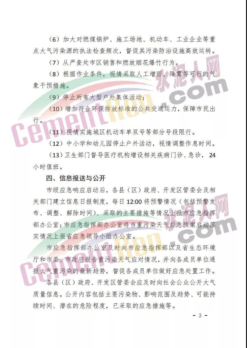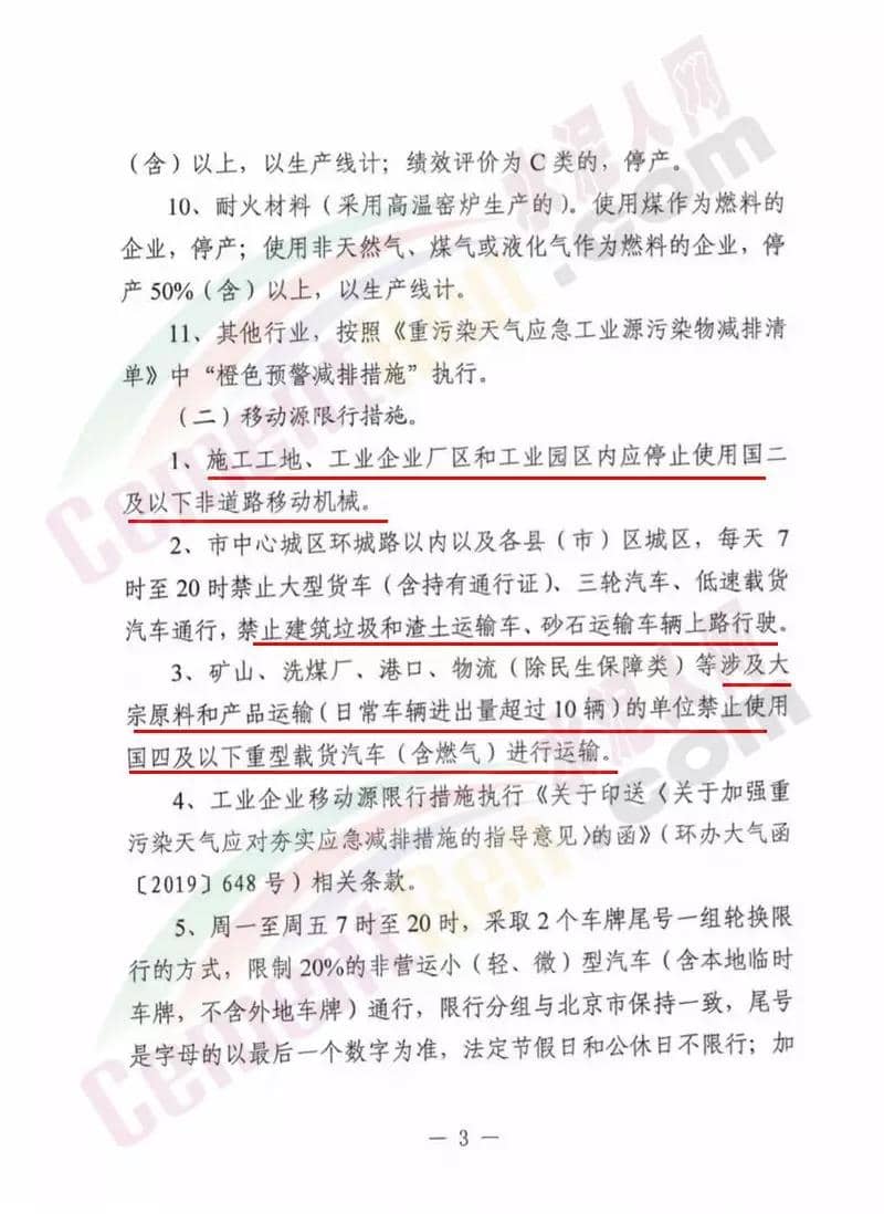 全面落實應急響應減排措施工業源停限產措施。水泥行業(特種水泥行業除外)。水泥制品、粉磨站停產;水泥熟料生產線停產;協同處置城市生活垃圾或危險廢物的企業,日處理生活垃圾與污泥總量低于400噸(含)、處理有毒有害廢棄物總量低于熟料產能4%(含)的生產線,停產。移動源限行措施。1、施工工地、工業企業廠區和工業園區內應停止使用國二及以下非道路移動機械。2、市中心城區環城路以內以及各縣(市)區城區,每天7時至20時禁止大型貨車(含持有通行證)、三輪汽車、低速載貨汽車通行,禁止建筑垃圾和渣土運輸車、砂石運輸車輛上路行駛。3、礦山、洗煤廠、港口、物流(除民生保障類)等涉及大宗原料和產品運輸(日常車輛進出量超過10輛)的單位禁止使用國四及以下重型載貨汽車(含燃氣)進行運輸。4、工業企業移動源限行措施執行《關于印送〈關于加強重污染天氣應對夯實應急減排措施的指導意見〉的函》(環辦大氣函〔2019〕648號)相關條款。揚塵源控制措施。礦山、沙石料廠、石材廠、石板廠等停止露天作業;施工工地停止土石方作業、建筑拆除、噴涂粉刷、護坡噴漿、混凝土攪拌等;主干道和易產生揚塵路段增加機掃和灑水頻次;未安裝密閉裝置易產生遺撒的煤炭、渣土、砂石料等運輸車輛停止上路。通知原文如下: