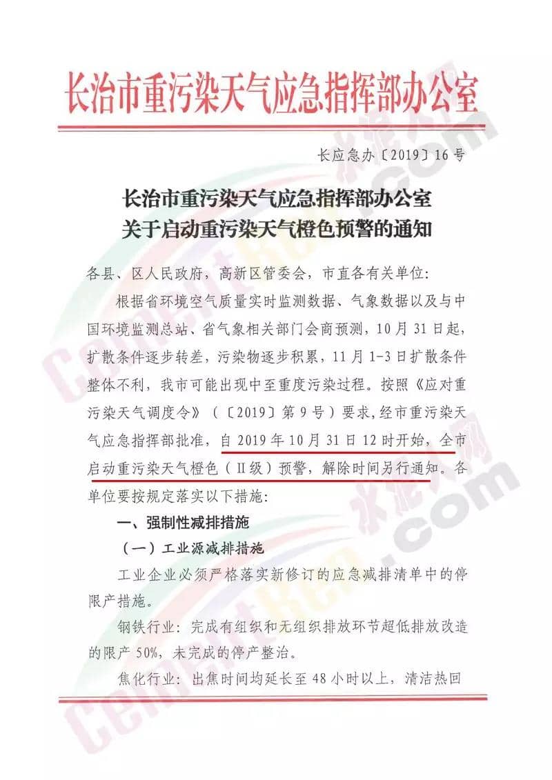 晉城市大氣污染防治工作領導組辦公室發布《晉城市重污染天氣應急指揮部關于啟動重污染天氣橙色預警的通知》稱:從10月30日20時啟動重污染天氣橙色預警(II級)。