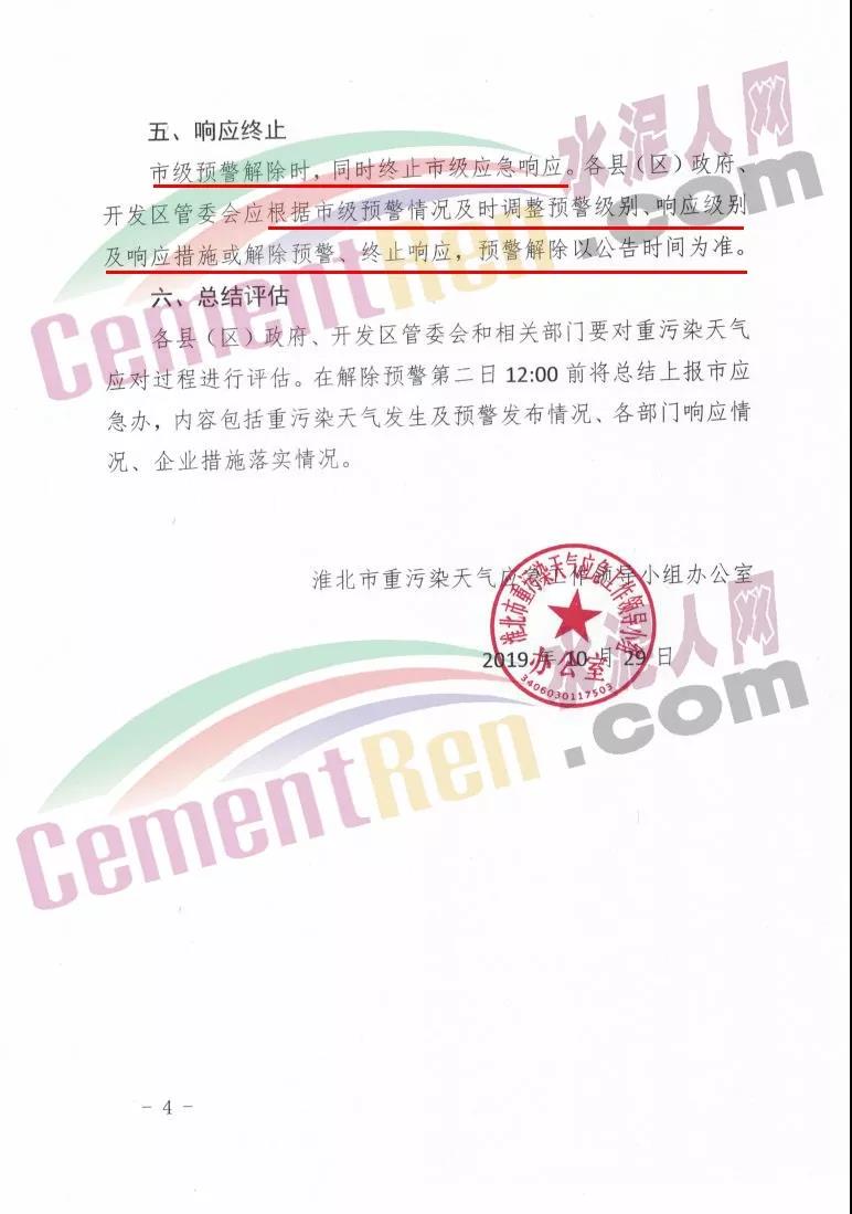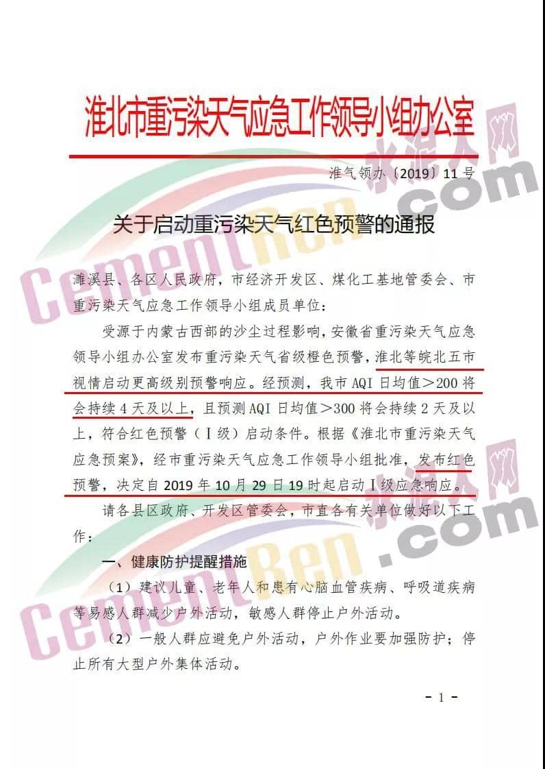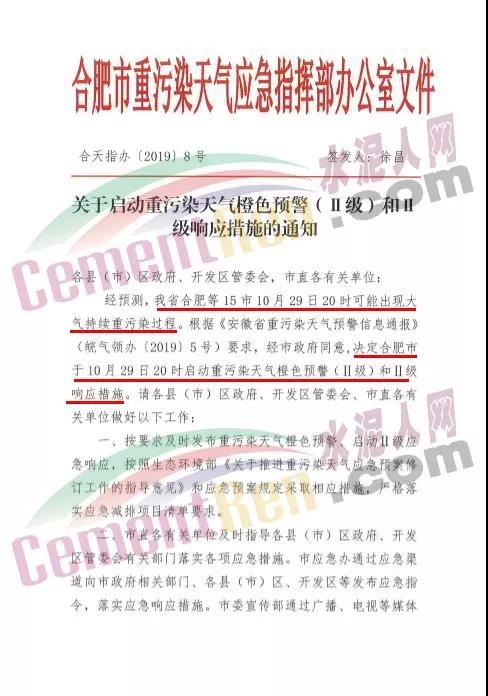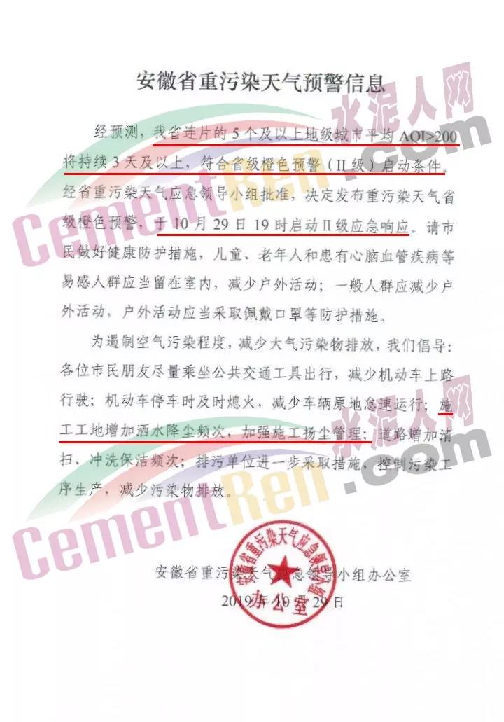 按照《安徽省重污染天氣預警信息通報》(皖氣領辦〔2019〕5號)要求,決定發布重污染天氣橙色預警,并于10月29日20時啟動Ⅱ級應急響應。對水泥企業采取限時停產、限排、限制運輸等措施。