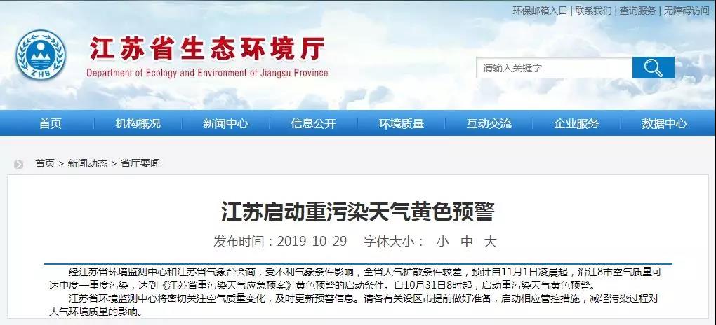 10月29日江蘇省生態環境廳也發布了預警信息:沿江八市31日起啟動重污染天氣黃色預警。據了解,預計自11月1日凌晨起,江蘇省沿江8市空氣質量可達中度-重度污染,達到《江蘇省重污染天氣應急預案》黃色預警的啟動條件。