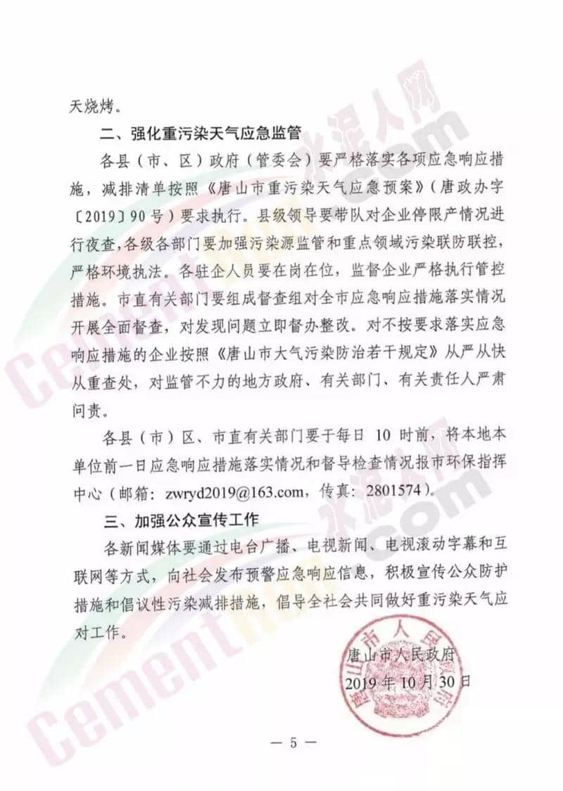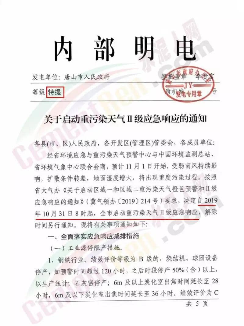 唐山市關于啟動重污染天氣Ⅱ級應急響應的通知稱,經省環境應急與重污染天氣預警中心與中國環境監測總站、省環境氣象中心聯合會商,預計11月1日開始,受弱南風持續影響,擴散條件轉差,污染物緩慢積累;地面濕度增大,受可能的逆溫影響,將出現PM2.5重度污染過程。按照省大氣辦《關于啟動區域一和區域二重污染天氣橙色預警和Ⅱ級應急響應的通知》(冀氣領辦〔2019〕214號)要求,市政府決定自2019年10月31日8時,全市啟動重污染天氣Ⅱ級應急響應,解除時間另行通知。