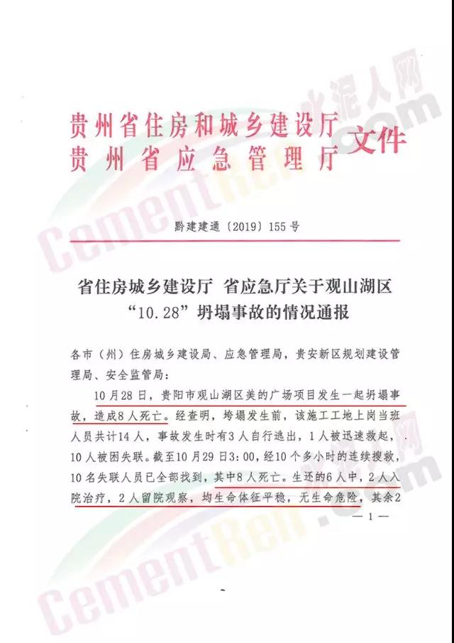 會議通報,觀山湖區美的置業廣場項目在建地下停車場于10月28日16:21許發生坍塌。倒塌發生前,該施工工地上崗當班人員共計14人,事故發生時3人自行逃出,1人被迅速救起,10人被困失聯。截至10月29日3:00,經10個多小時的連續搜救,10名失聯人員已全部找到,其中8人死亡。生還6人中,2人入院治療,2人留院觀察,均生命體征平穩,其余2人經檢查身體無恙已返回住處。