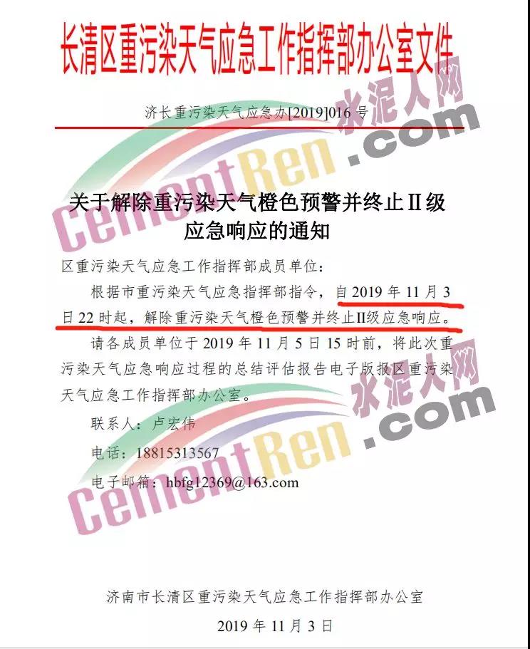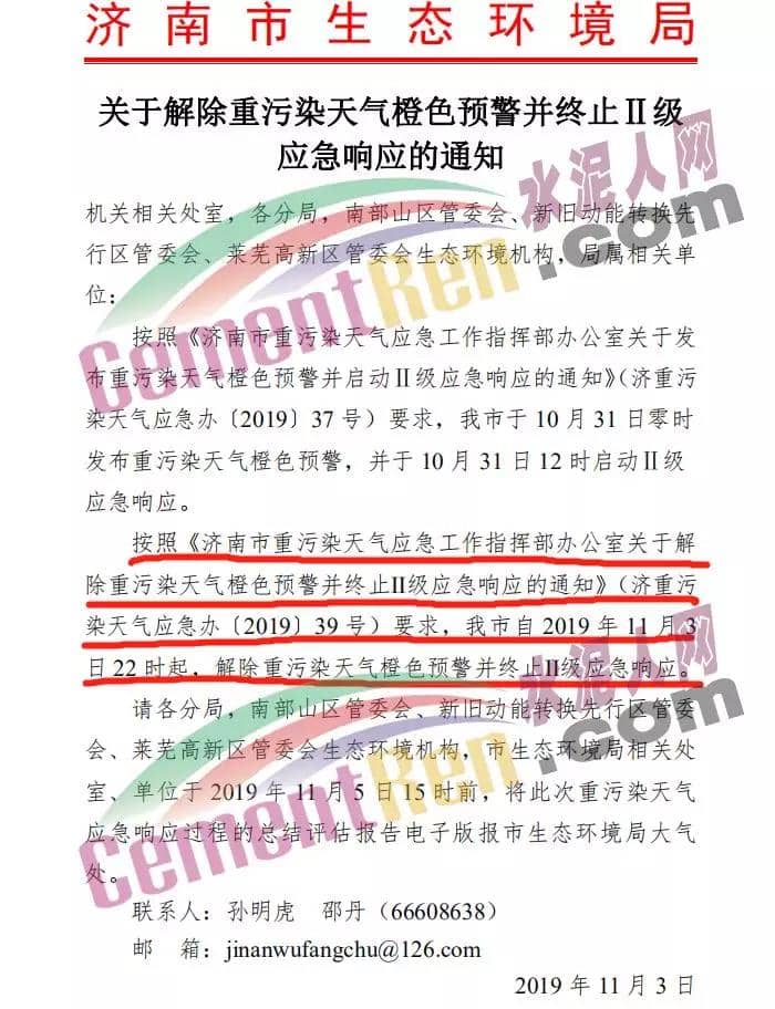 據水泥人網了解,昨日(11月3日)濟南市生態環境局發布《關于解除重污染天氣橙色預警并終止II級應急響應的通知》稱,按照《濟南市重污染天氣應急工作指揮部辦公室關于解除重污染天氣橙色預警并終止II級應急響應的通知》(濟重污染天氣應急(2019)39號),濟南市2019年11月3日22時起,解除重污染天氣橙色預警并終止II級應急響應。