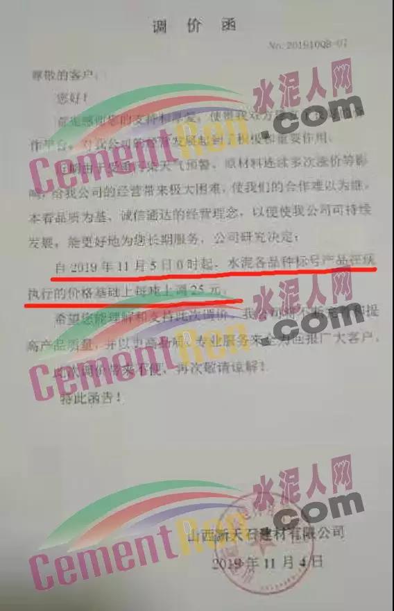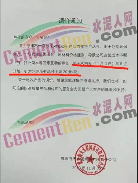 11月4日,安徽銅陵地區水泥行情上漲20元/噸,現主流品牌P.O42.5散裝水泥價格在490-500元/噸。銷量小幅提升,主要因庫存偏低,水泥行情偏強運行?! ?1月4日,湖北荊州、荊門地區水泥價格上調20-30元/噸,下游區域水泥價格大幅上調,本地水泥價格隨之上調,目前正逐步落實中,落實情況還有待跟蹤?! ?1月2日,冀東海天水泥聞喜有限公司發布調價通知稱:由于近期環保限產,市場發生巨大變化,原材料價格猛漲,導致公司運營成本不斷上升,公司本著互惠互助原則,從11月3日早8點開始,所有品種水泥上調20元/噸。