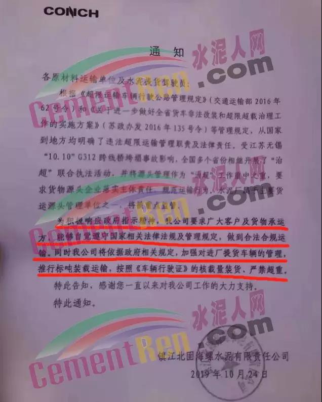 海螺水泥向超載開刀 同時鎮江北固海螺水泥發布通知稱:為積極響應政府指示精神,鎮江北固海螺水泥要求廣大客戶及貨物承運方,能夠自覺遵守國家相關法律法規及管理規定,做到合法合規運輸。同時,鎮江北固海螺水泥將依據政府相關規定,加強對進廠提貨車輛的管理,推行標噸裝載運輸,按照《車輛行駛證》的核載量裝貨,嚴禁超重。