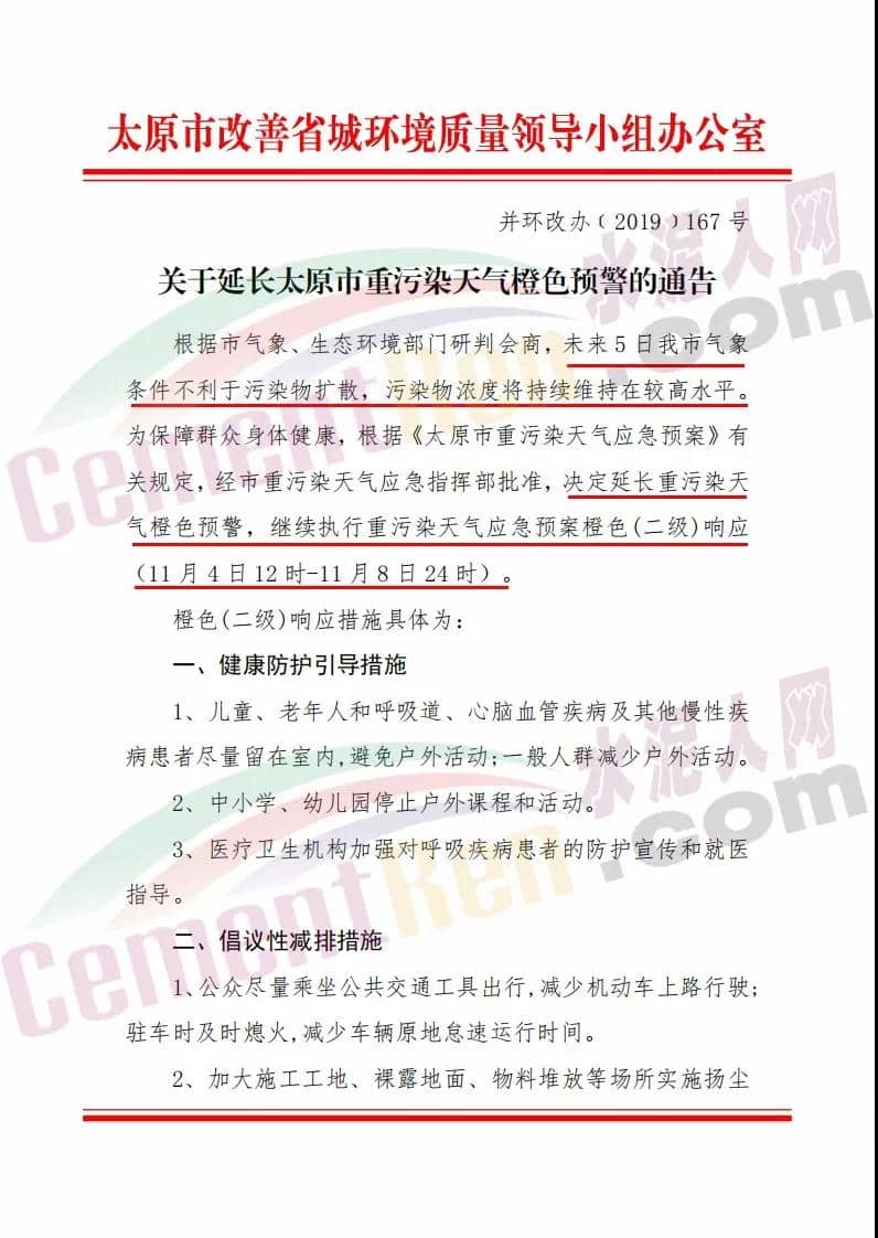水泥人網消息:日前,太原市人民政府發布了《關于延長太原市重污染天氣橙色預警的通告》稱:根據太原市氣象、生態環境環境部門研判會商,未來5日太原市氣象條件不利于污染物擴散,污染物濃度將持續維持在較高水平,為保障群眾身體健康,根據《太原市重污染天氣應急預案》有關規定,經太原市重污染天氣應急指揮部批準,決定延長重污染天氣預警,繼續執行重污染天氣應急預案橙色二級響應(11月4日12時-11月8日24時)。通告原文如下: