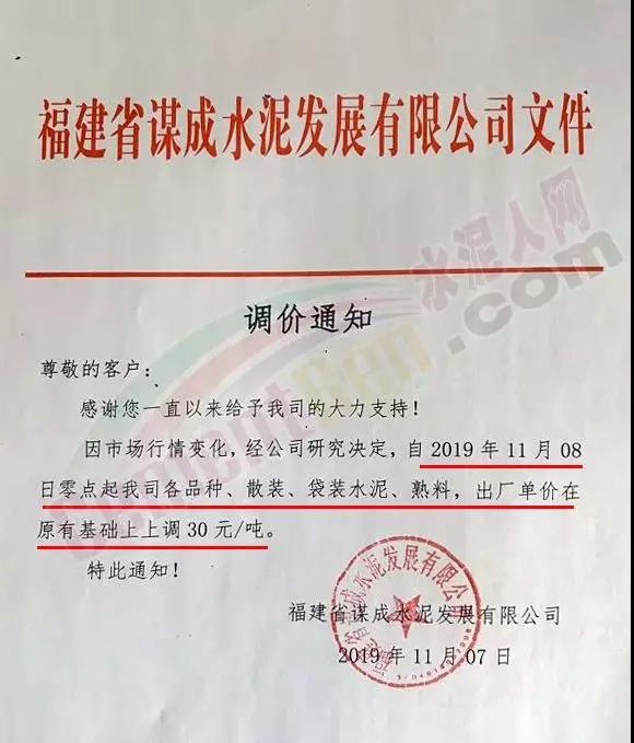 根據市場情況,經研究,決定從2019年11月8日零時起,本公司發往福建省內各品種各規格型號水泥在原價格基礎上上調30元/噸。