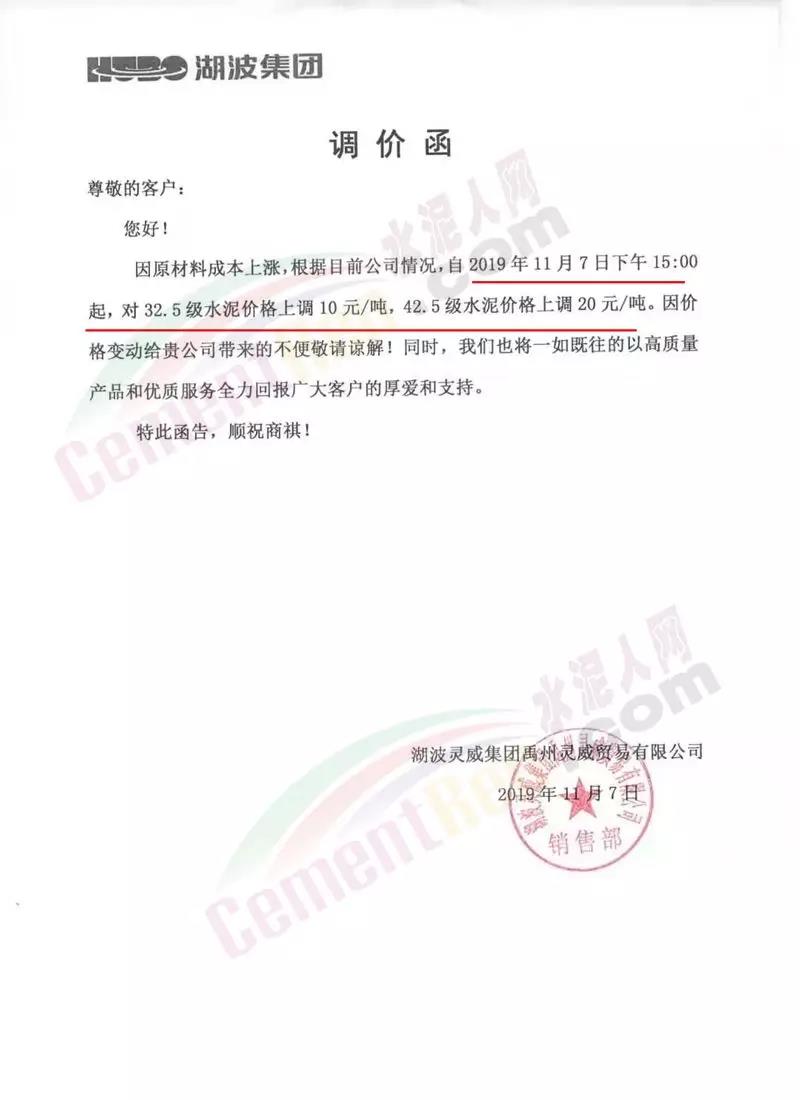 同期,區域主導企業湖波水泥也上調了水泥價格。調價通知如下: