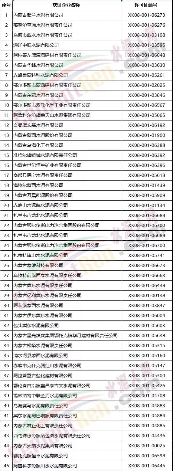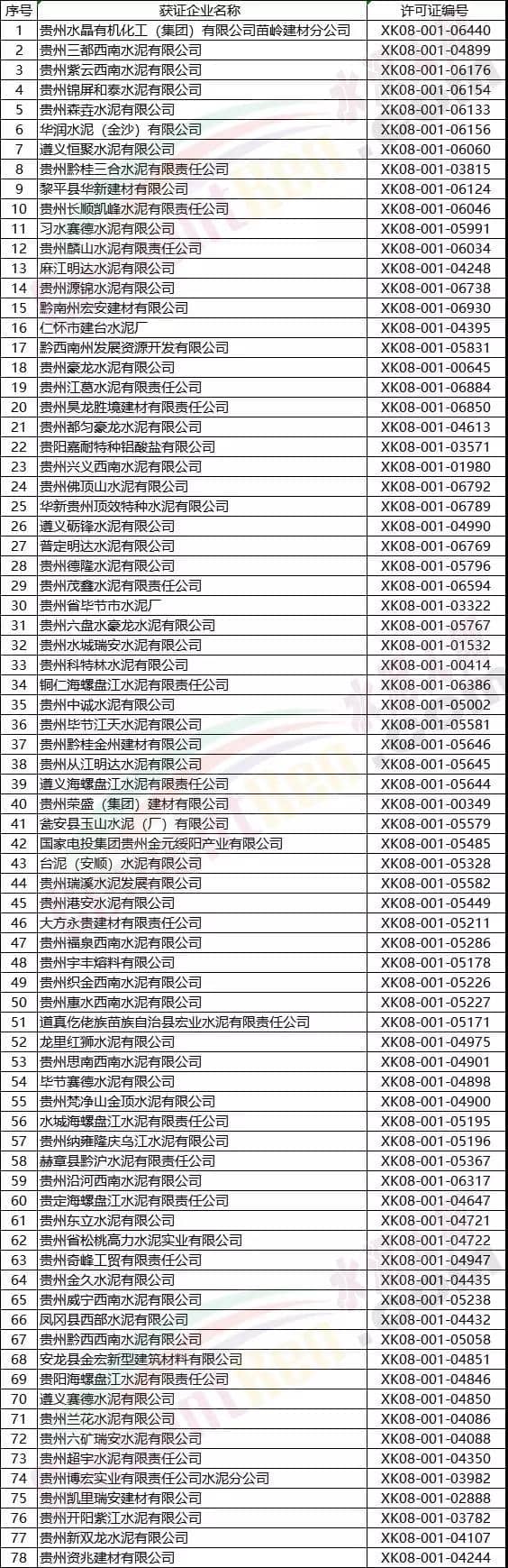 來源:市場監管總局生產許可證辦公室浙江省部分熟料生產企業名單
