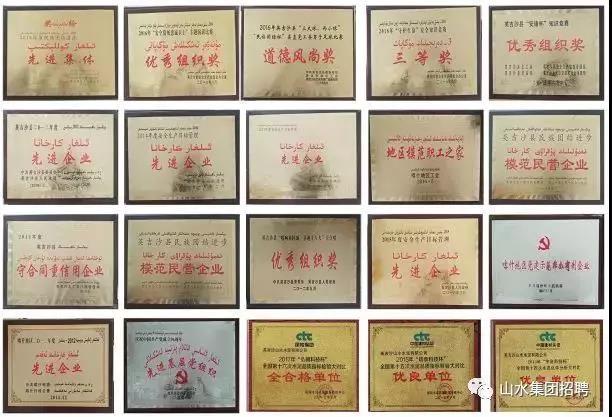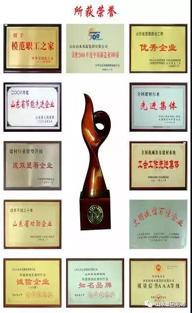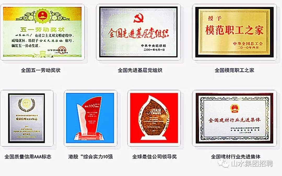 多年來,山水集團(tuán)先后被授予全國建材系統(tǒng)先進(jìn)集體、全國五一勞動獎狀、全國先進(jìn)基層黨組織、全國模范職工之家、山東省文明單位、山東省納稅百強(qiáng)企業(yè)、香港上市公司100強(qiáng)、中國500強(qiáng)、中國建材行業(yè)20強(qiáng)等榮譽(yù)稱號。
