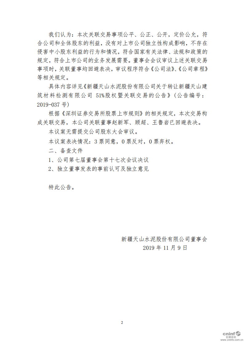 11月8日,天山股份公布,公司于2019年11月8日以通訊表決方式召開第七屆董事會第十七次會議,審議通過了《新疆天山水泥股份有限公司關于轉讓新疆天山建筑材料檢測有限公司51%股權暨關聯交易的議案》。