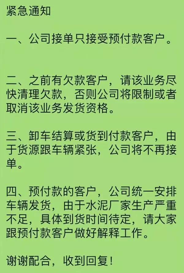 日前,山西省區(qū)域某水泥企業(yè)發(fā)出緊急通知稱,公司只接受預(yù)付款客戶,之前欠款客戶未清理欠款的將限制或取消發(fā)貨資格,卸車結(jié)算或貨到付款客戶,由于貨源、車輛緊張,公司將不再接單。預(yù)付款的客戶公司統(tǒng)一安排車輛發(fā)貨,由于水泥廠家生產(chǎn)嚴(yán)重不足,具體到貨時間待定。