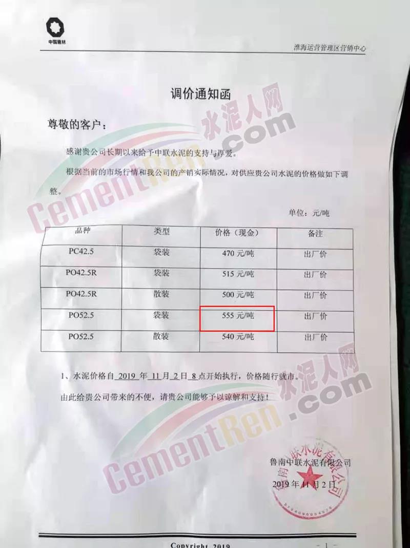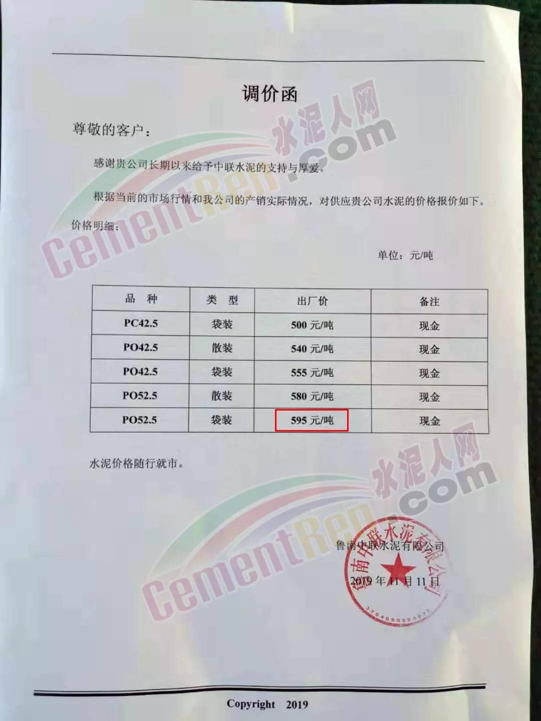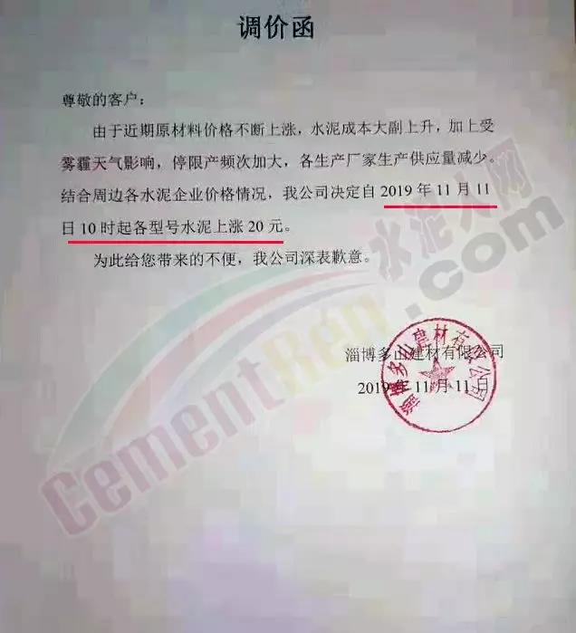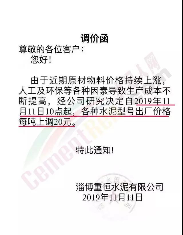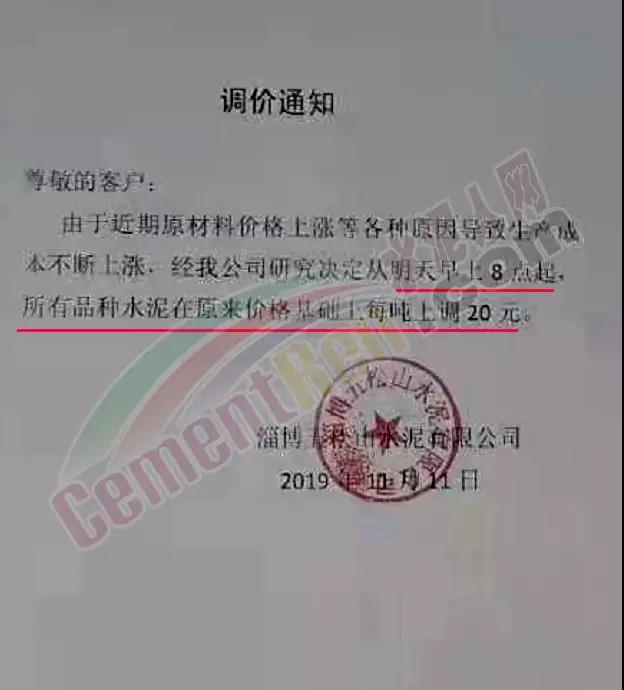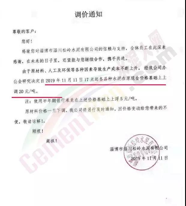 淄博魯中水泥有限公司調(diào)價函稱,根據(jù)當(dāng)前水