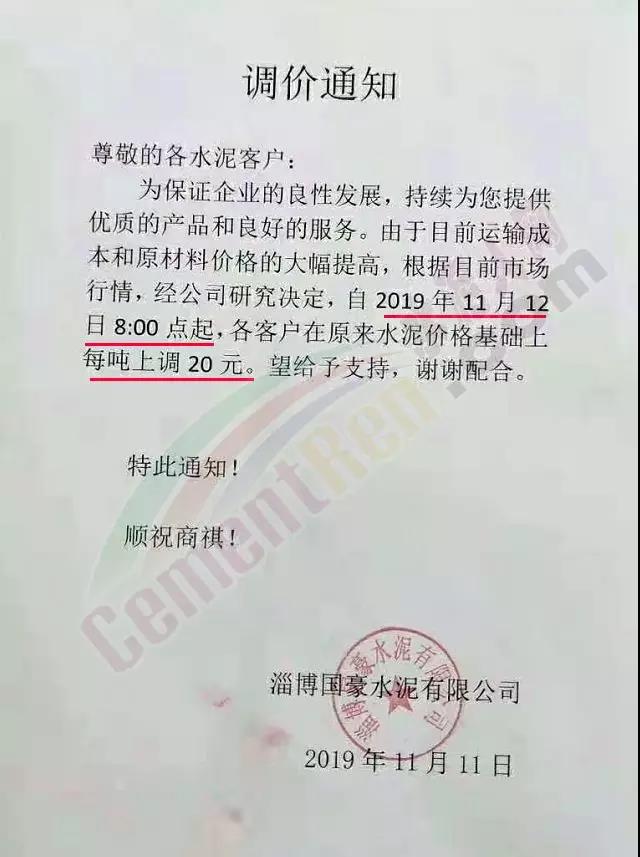 淄博國豪水泥有限公司調(diào)價通知稱,由于目前運(yùn)輸成本和原材料價格的大幅提高,根據(jù)目前市場行情,經(jīng)公司研究決定,自11月12日早8時起,在原來水泥價格基礎(chǔ)上每噸上調(diào)20元。