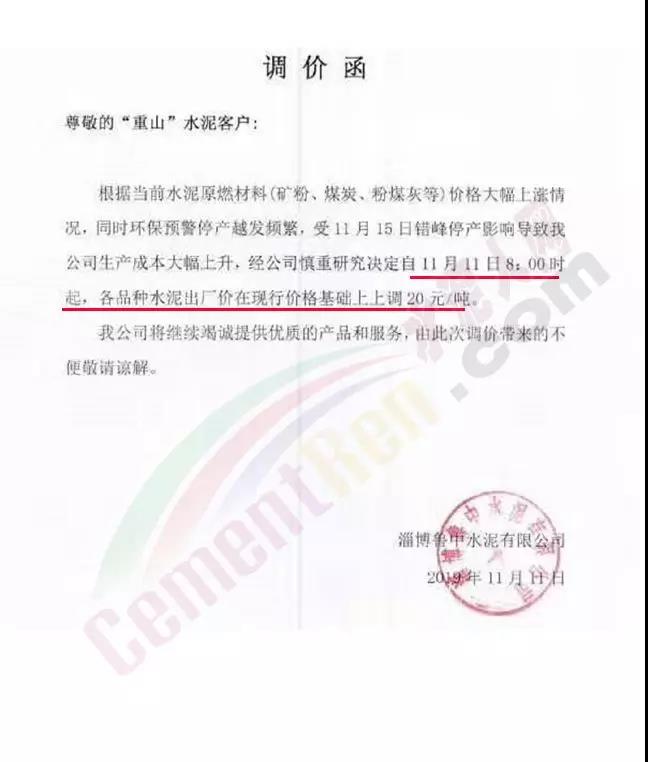 泥原燃材料(礦粉、煤炭、粉煤灰等)價格大幅上漲情況,同時環(huán)保預(yù)警停產(chǎn)越發(fā)頻繁,受11月15日錯峰停產(chǎn)影響導(dǎo)致公司生產(chǎn)成本大幅上升,經(jīng)公司慎重研究決定 自11日早8時起,各品種水泥出廠價在現(xiàn)行價格基礎(chǔ)上上調(diào)20元/噸。
