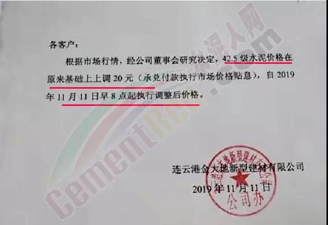 昨日江蘇多家企業(yè)通知上調(diào)水泥價格。其中連云港金大地新型建材有限公司通知,42.5級水泥自11月11日早8點(diǎn)起上調(diào)20元/噸。