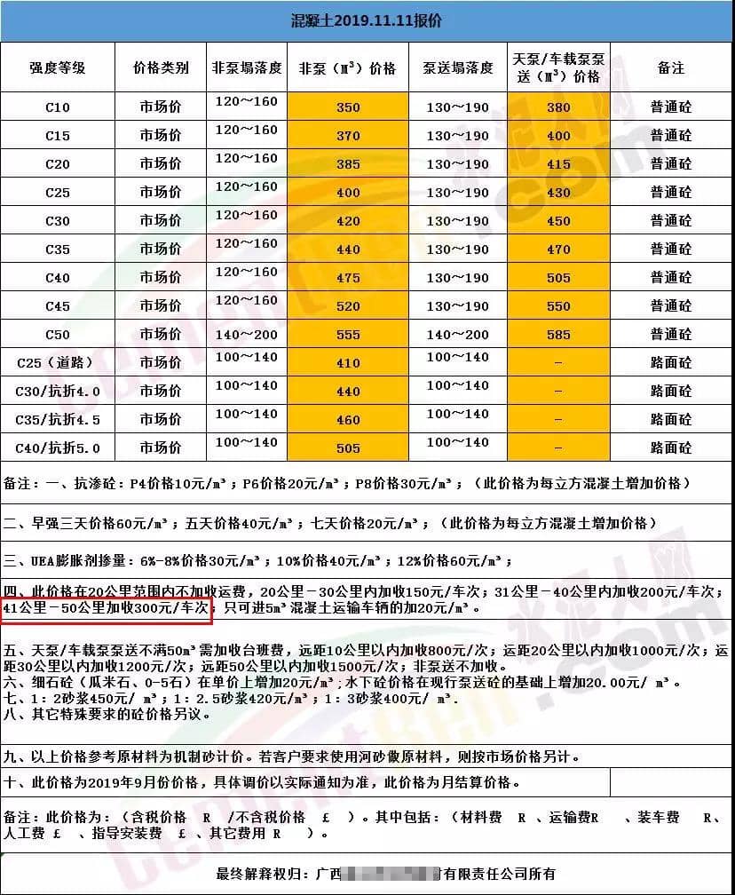 廣西區(qū)域某混凝土企業(yè)11月11日報價顯示距離 41-50公里加收300元/方。C30非泵送報價最高420元/m³。與廣區(qū)江門地區(qū)價格相差210元/m³。